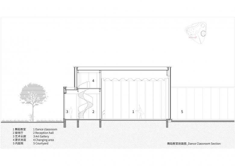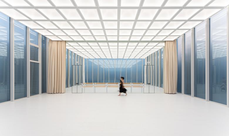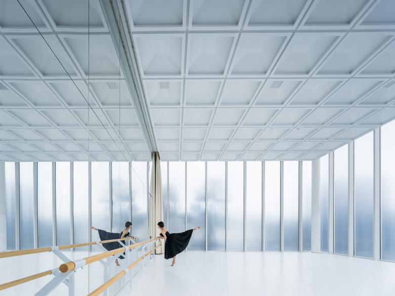 In 2009 I visited a dance school in London designed by Herzog & De Meuron. The director politely told me that dancers want to have a lot of light when they train. The so-called beautiful landscape and colorful façade would interfere with their emotions. I designed the dance studio at the Monologue as a translucent glass box, with enough light but filtering out the outdoor scenery as a backdrop. Behind the mirrored wall of the classroom is the entrance foyer and the dressing room in the mezzanine. The dancers can then dance as above and so below.