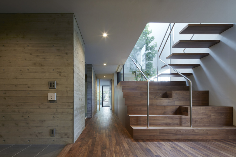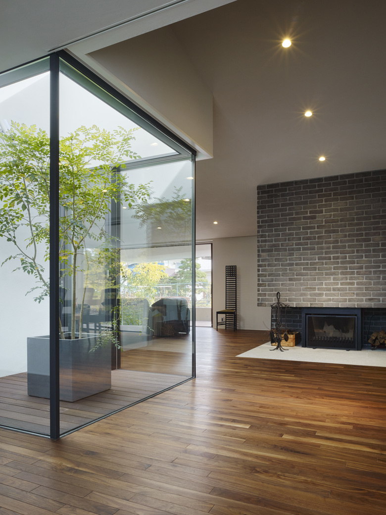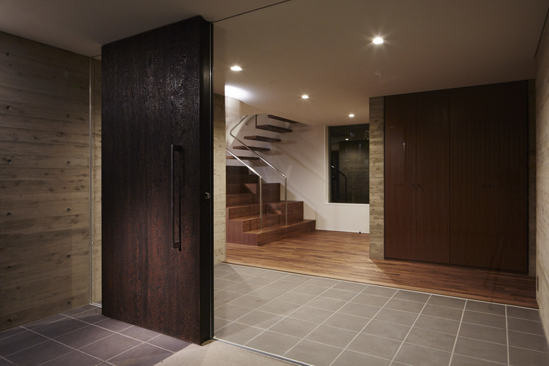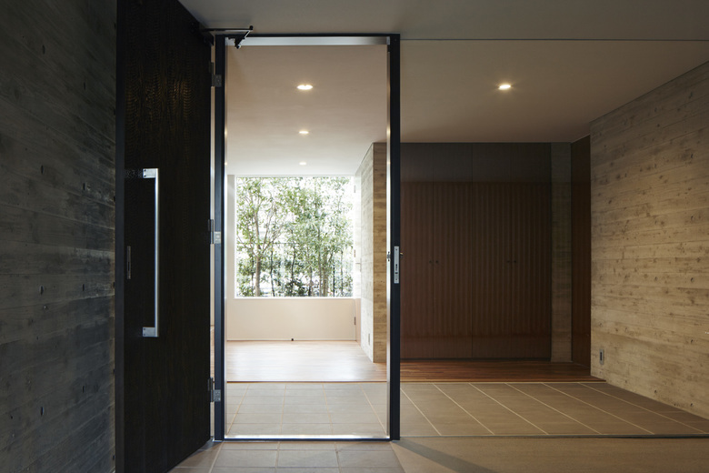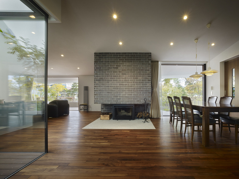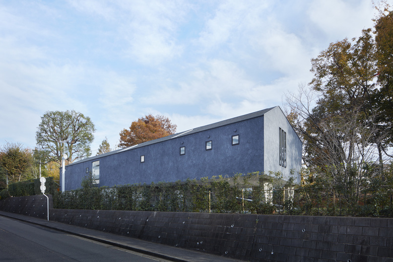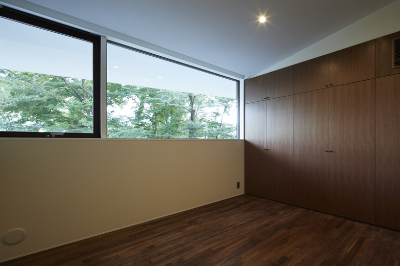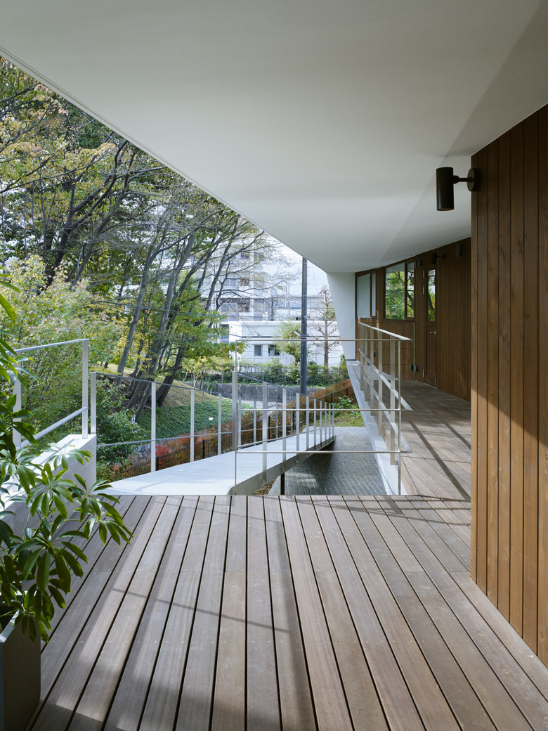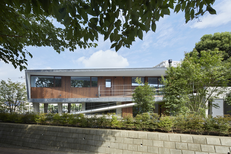 440坪の敷地を分割して2棟の住宅を建設する計画のⅠ期工事。敷地北側の10mを超えるクスノキやケヤキなどの既存樹木を残すことと、南隣地に残された雑木林に開くように建物を配置した。さらに1階西側には新たに庭を用意した。それらの外部環境にウッドデッキ、スロープ、ピロティが付随することで庭をより身近に感じながら生活できるようにした。