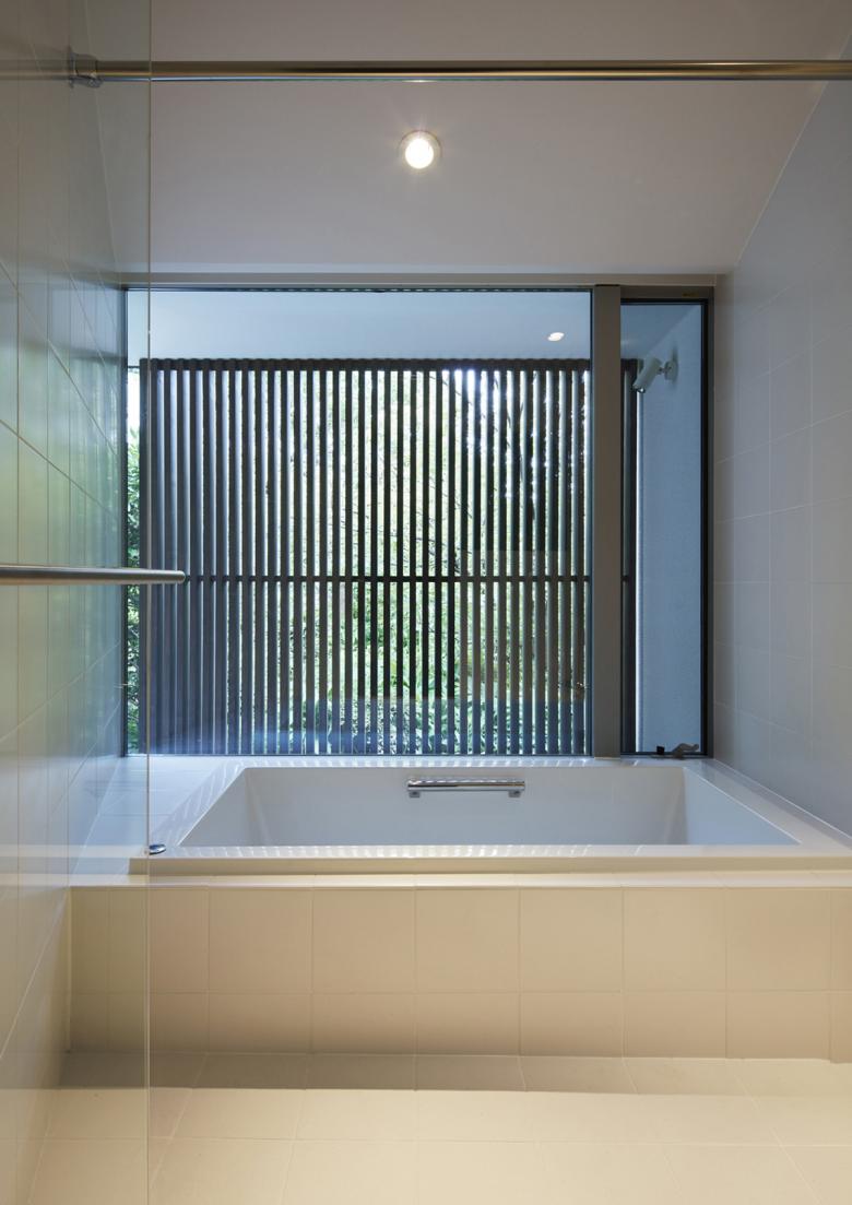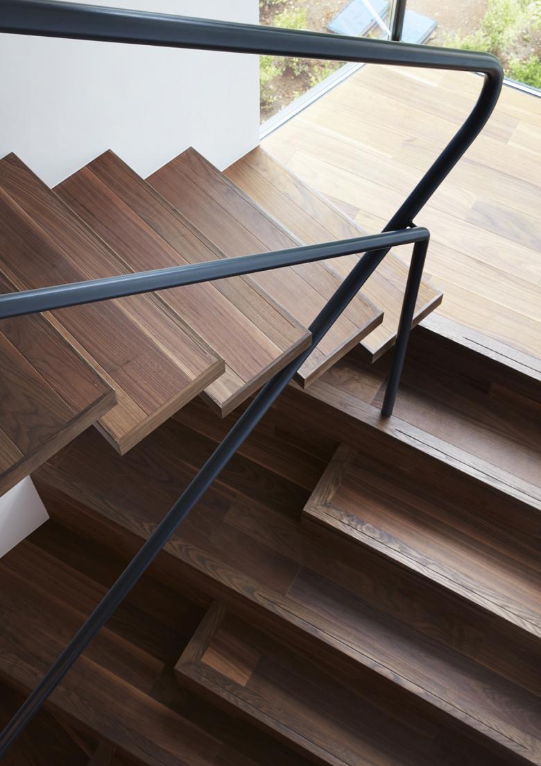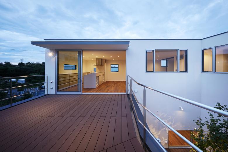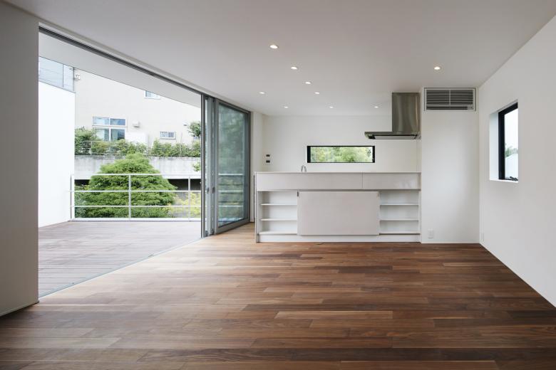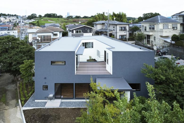 敷地は横浜の郊外にある市街化調整区域内の丘陵地にある。 1階の親世帯にはお母さんと3女のお嬢さんと数匹のネコ、2階子世帯はご夫婦とお嬢さんの3人が住む。玄関だけは共有で後は完全分離型となっている。敷地の西側には様々な樹木が生い茂り、自然林のような庭があり、北側の玄関の脇には大きな柿の木があった。それらの既存の樹木はなるべく残すように建物の配置を検討した。 敷地の大きさが約 150坪と余裕があったため、プライバシーを確保するために中庭を中心にもったロの字型の平面構成がふさわしいと考えた。ただ2階建ての建物で完全に囲まれた中庭は閉塞感があるので、中庭を周辺環境に接続したいと思った。 1階では勾配のきつい坂道からフラットで入れる東側に2台分のガレージをつくり、中庭とつないだ。そのため内部空間は東に開いたU字型となっている。一方2階では西方向に眺望が広がっていたので、西側の一辺に大きなテラスを設けて、内部空間は西に開いたU字型とした。中庭は1階では東に開き、2階では西に開いていて2方向に抜けがあるため、光が入りやすく風が通り抜ける。そこに高さ3mのマルバノキを植えた。 この中庭の木を中心に 2世帯が一体感をもって暮らせる家となっている。