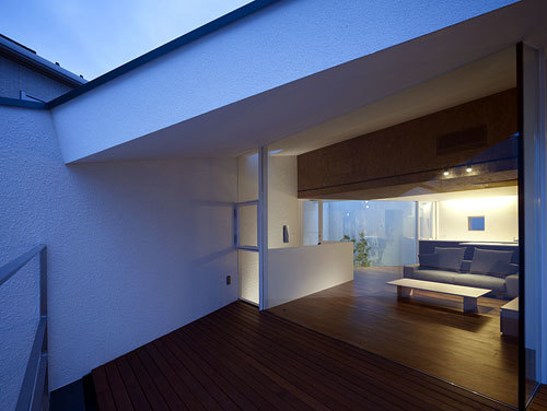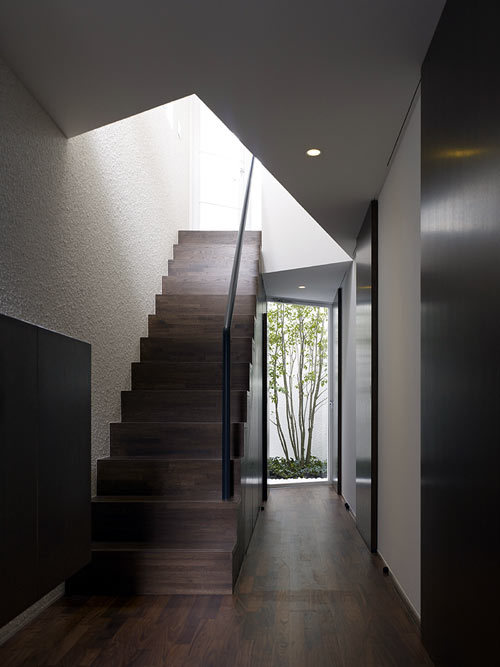 アプローチの階段の上部にオーバーハングした壁により上空を囲まれた庭、周辺と連続しながら玄関前のアプローチ空間を生み出している。また2階では南側に開いたテラスとなっている。