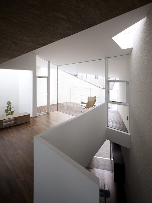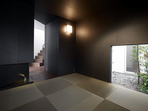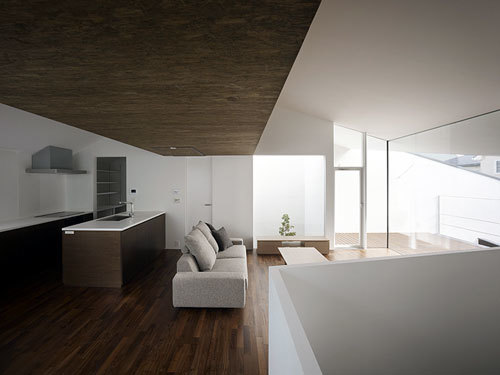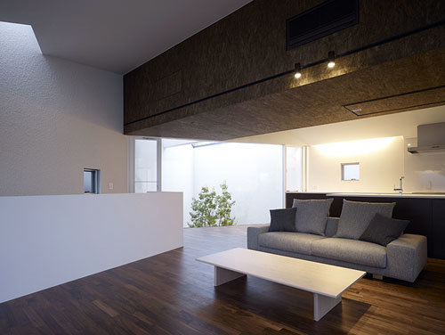 そこで敷地周辺に壁をたて、プライバシーを確保し、その内側の3つの隅に正確の異なる3つの中庭をつくった。日照条件を考慮して、1階は寝室や水周り、客室としての和室などの個室を配置し、2階に主な生活空間であるリビング・ダイニングを配置している。