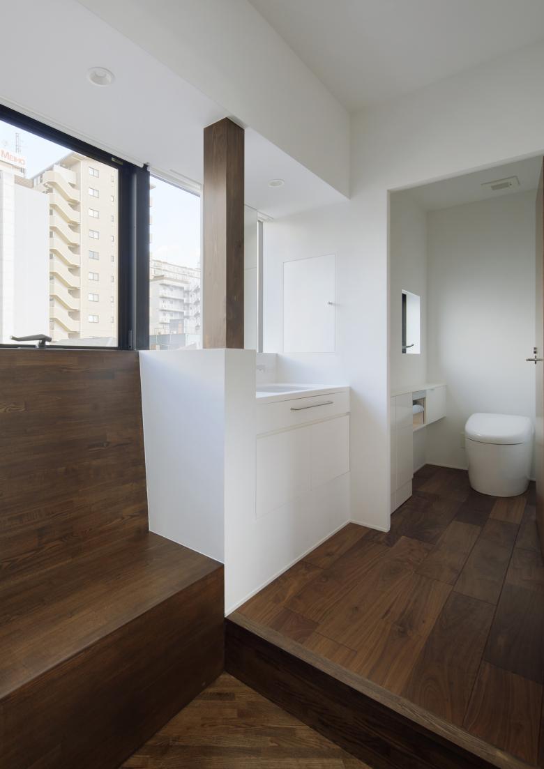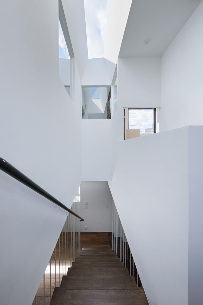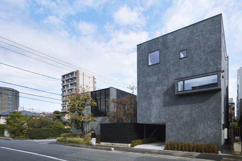 5年の歳月を経て2つの家をつくった。 1つ目の家USは5年前に竣工したご両親の家でご主人のお母さんとの2世帯住宅だった。 2つ目の家USⅡはご実家の隣地につくられたご長男家族のための住まいである。敷地は18坪しかないため、建蔽率いっぱいの3階のボリュームを道路側に寄せて配置した。矩形平面の中央に直階段を配置した単純な構成であるが、階段により分節された2つの空間の床レベルを40cmずらしている。1階と3階は細かく空間が仕切られているが、2階のリビング・ダイニングは大きな一つの空間となっている。中央の階段はスチールのロッドで吊られていて空間をやわらかく分節している。 2階部分の北側に、柿の木に隣接するテラスをつくった。このテラスから柿の木の向こう側にある隣地のご両親の家のテラスやダイニングに視線が通り、お互いの気配が感じられる距離感を生み出している。また外部階段により2つの家の2階のテラスが結ばれ、2階レベルで2つの家を直接行き来できるようになっている。 家族の長い記憶が刻まれた柿の木のまわりに4世代にわたるご家族が寄り添うように住むために、外部空間のネットワークが生まれるように考えられた住宅である。