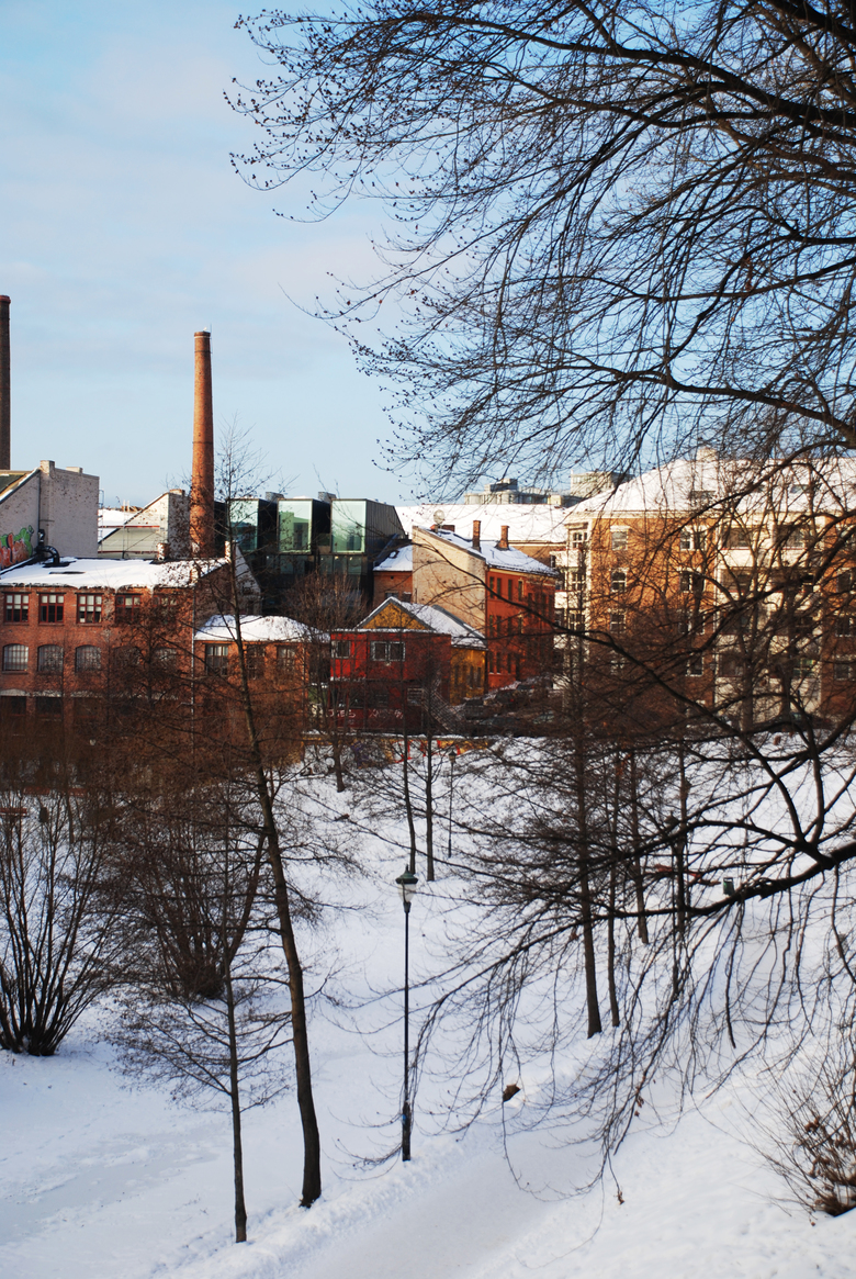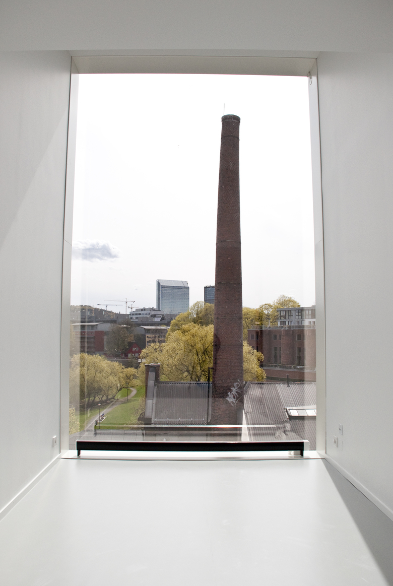 Load bearing floors are prefabricated concrete. Terrace and outdoor furniture are cast-in-place concrete. The building is covered in glass to the south and handcrafted brick to the north. The chosen brick is a horizontal, black, handcrafted brick named Kolumba, developed by Peter Zumthor for the Kolumba museum in Cologne. It measures lxwxh 528x108x37 mm. The roof and parts of the facade towards south is coated with zinc.