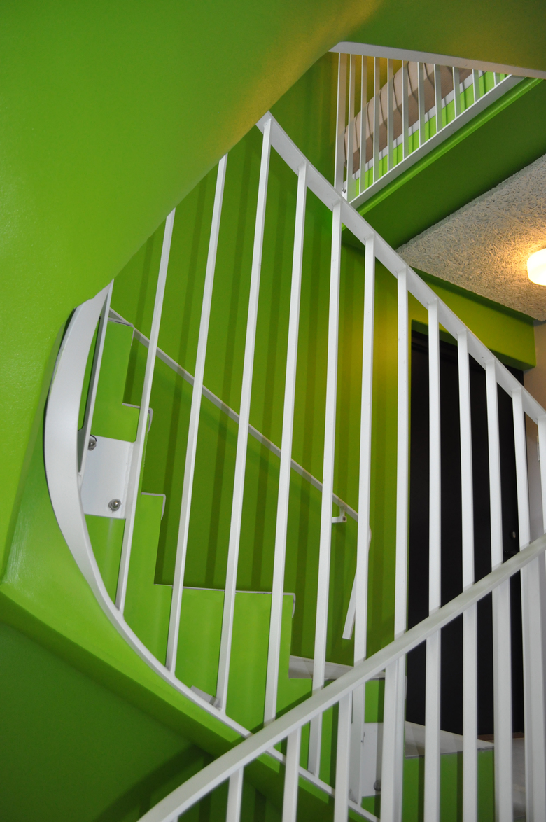 The facades appear in shades of black; black brick, black zinc, while indoors one will find elements of fresh hues. The green colour reappears in stairwells, the entry zone, and on the south balconies. The colours in the apartments are kept neutral with shades between black and white.