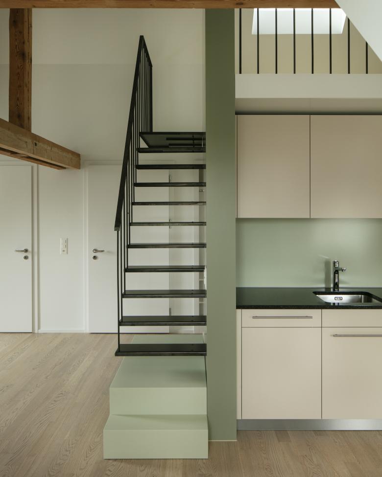 Durch den respektvollen Einbau von je einer neuen Lukarne auf den Walmseiten des Daches, deren Proportionen den Bestand respektieren, konnte der vormals kleinteilige Dachraum in einen hellen Wohnraum verwandelt werden. Die beiden neuen 2,5-Zimmer-Wohnungen sind symmetrisch angeordnet. Ein kompaktes Möbelstück mit Einbauschränken auf der einen, die Küche auf der anderen Seite und eine darüber liegende Galerie, lassen einen grosszügig und luftig wirkenden Raum unter dem Dach entstehen. Die grünliche Farbe ist eine Neuinterpretation der Farben aus der damaligen Zeit und wirkt komplementär zu den sichtbar belassenen Ziegelsteinen der Brandschutzmauer.