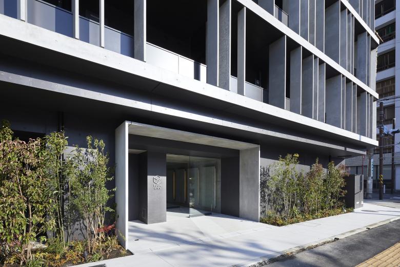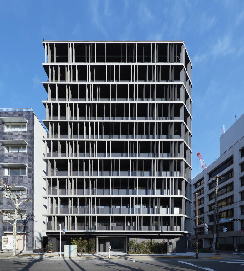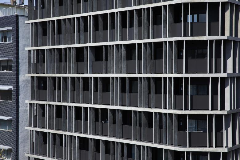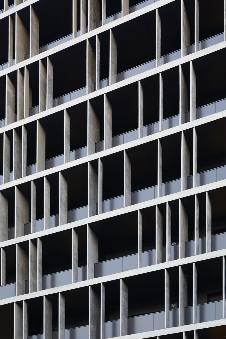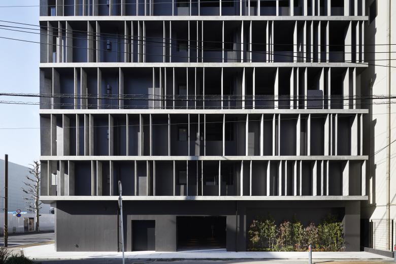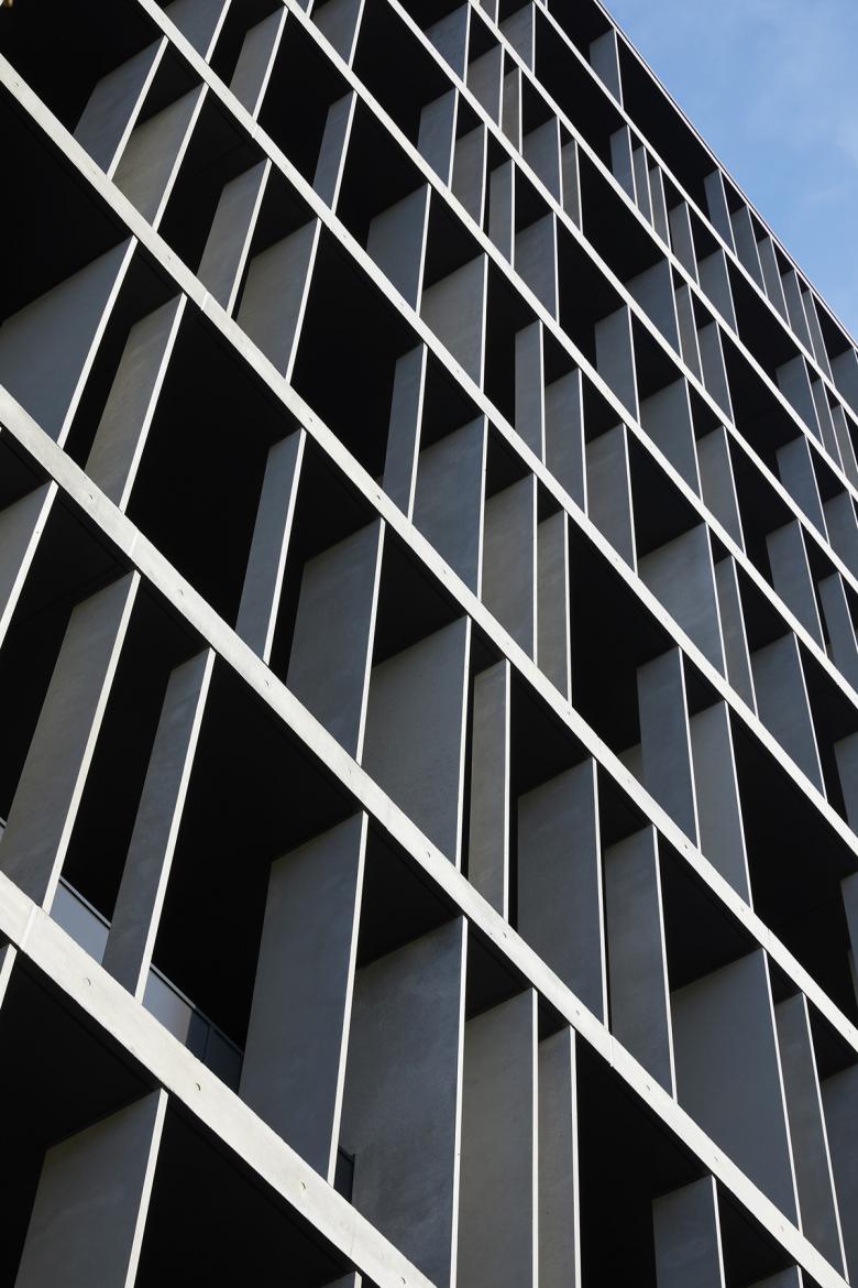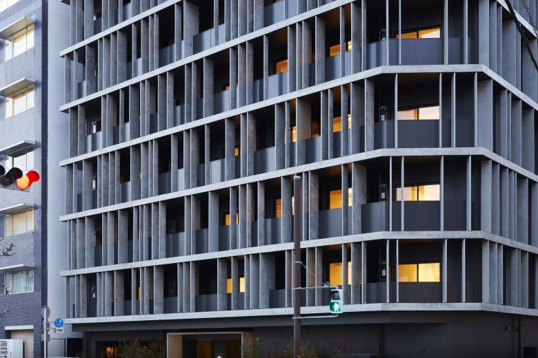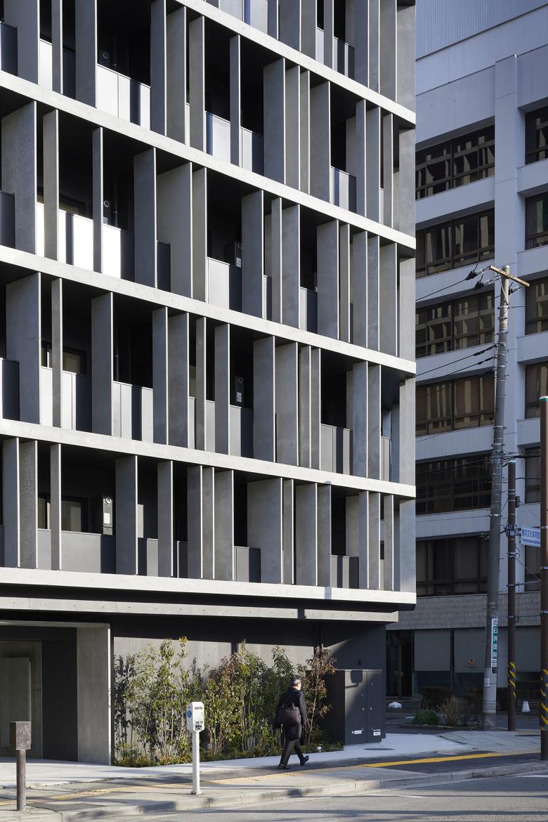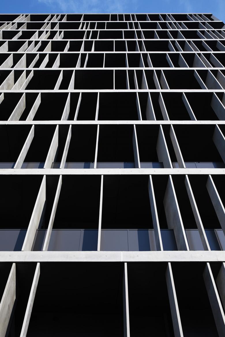 このプロジェクトでは、各階のスラブを前面まで持ち出して水平ラインを強調する事で、水平性を強調して、近隣の防火帯建物に馴染ませる様にしている。また、バルコニーで小さな住戸ユニットが強調されず、ファサードを大きな面として表現しつつも、内部から感じる開放感を失わない様にするために、これらの水平スラブの間に縦糸の様に薄いコンクリートパネルを配置した。隔て壁部分には住戸区画を兼ねた奥行きの深いパネル、それ以外の部分にも様々な奥行きのパネルをランダムに設置する事で、戸境を目立たせないようにしつつ、ファサード全体をリズミカルな面として表現した。