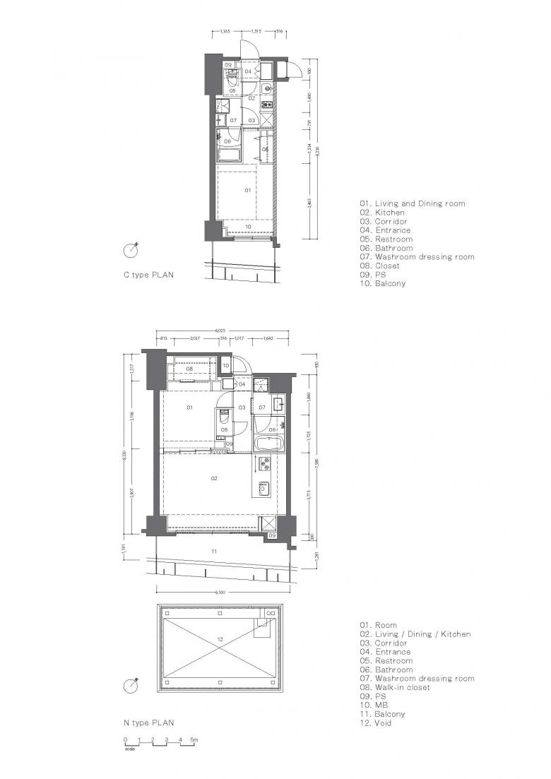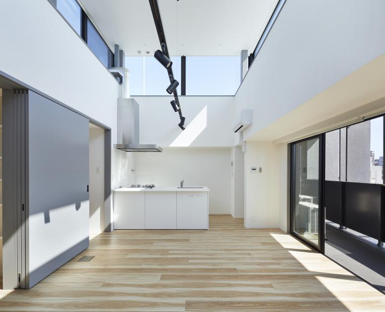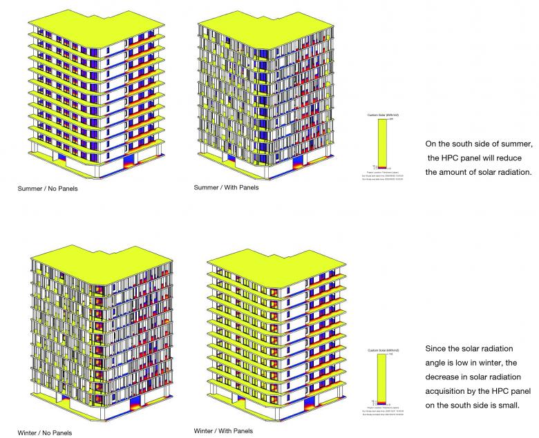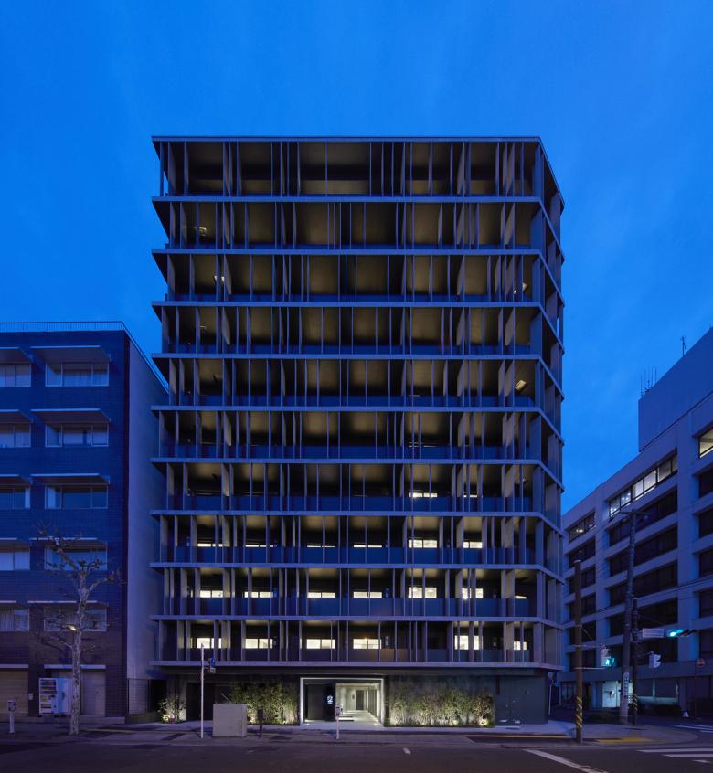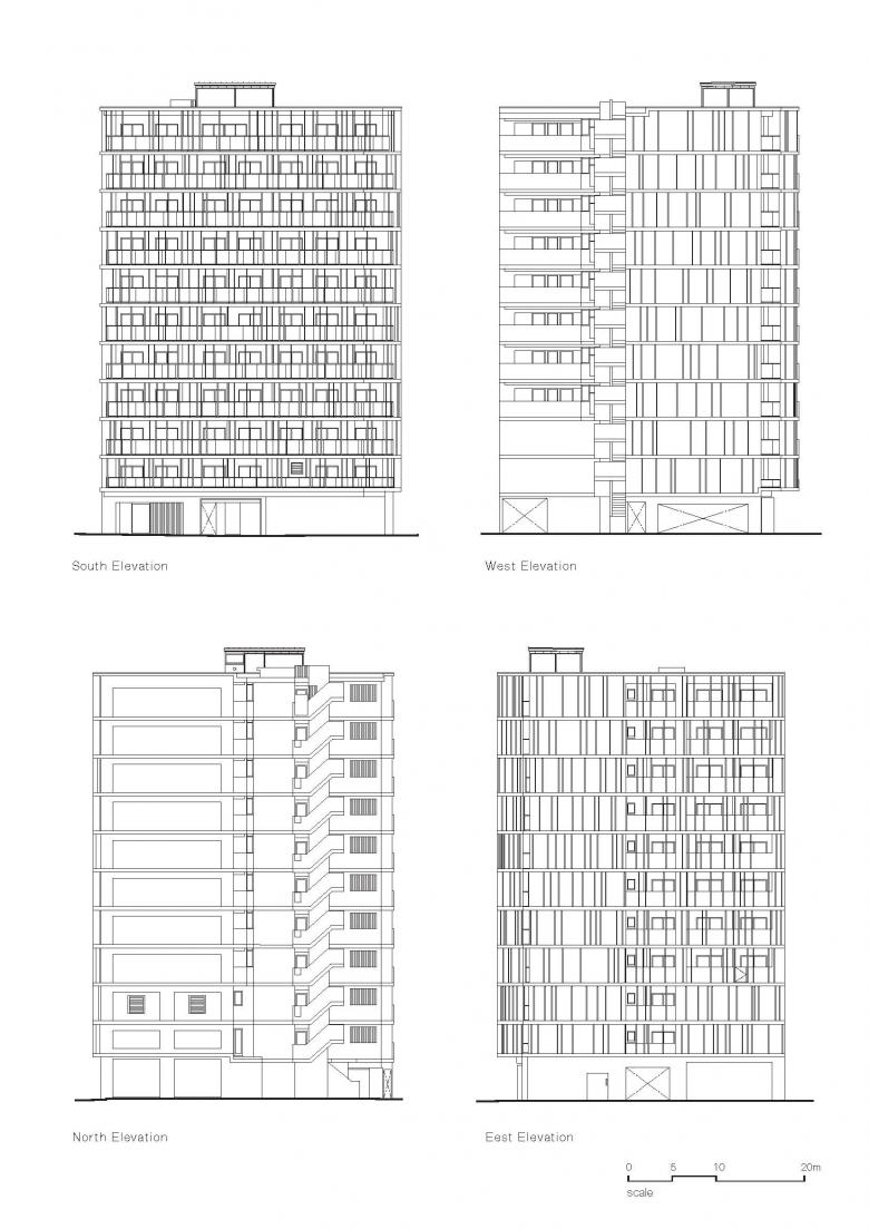 集合住宅は、中の構成をそのままファサードに表現される事が多いが、内部から求められる開放性を確保しながら、ファサードの面を形成するために、微細なパネルで内部の要素を包んだ。防火帯建築の様に通りに面する都市の構成要素としてのファサードの可能性に着目し、デザインの多様性も持ちながらも、既存の建物群と有機的な関係を持って、都市空間を形成できないかと考えた。