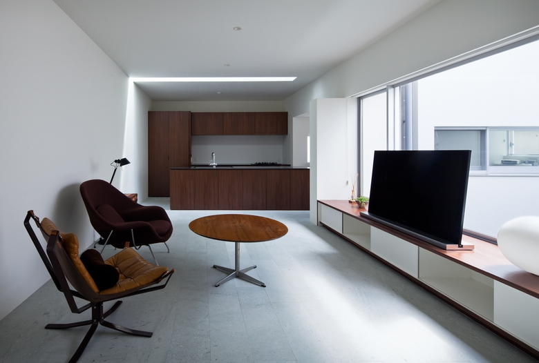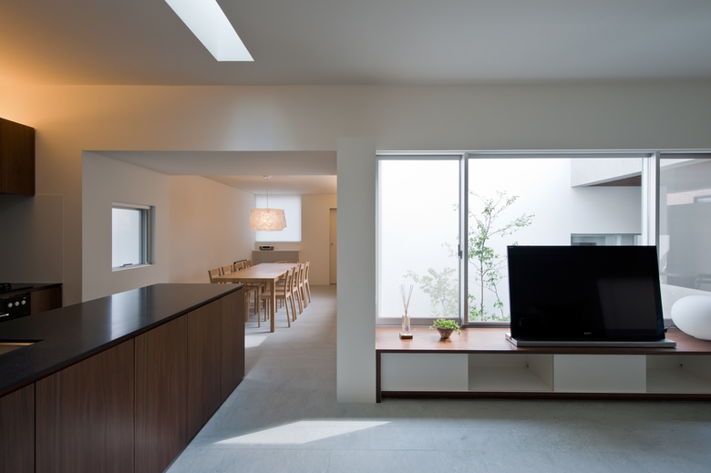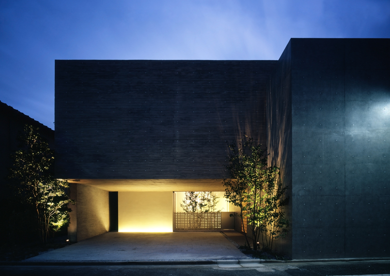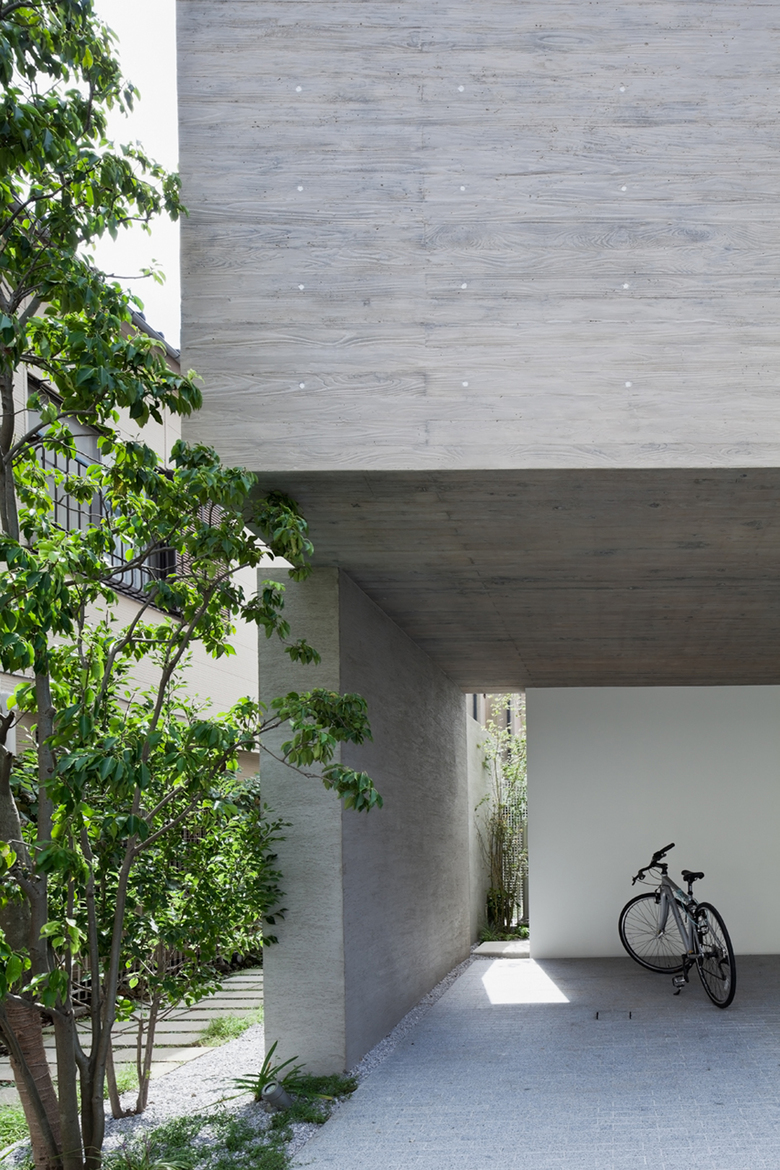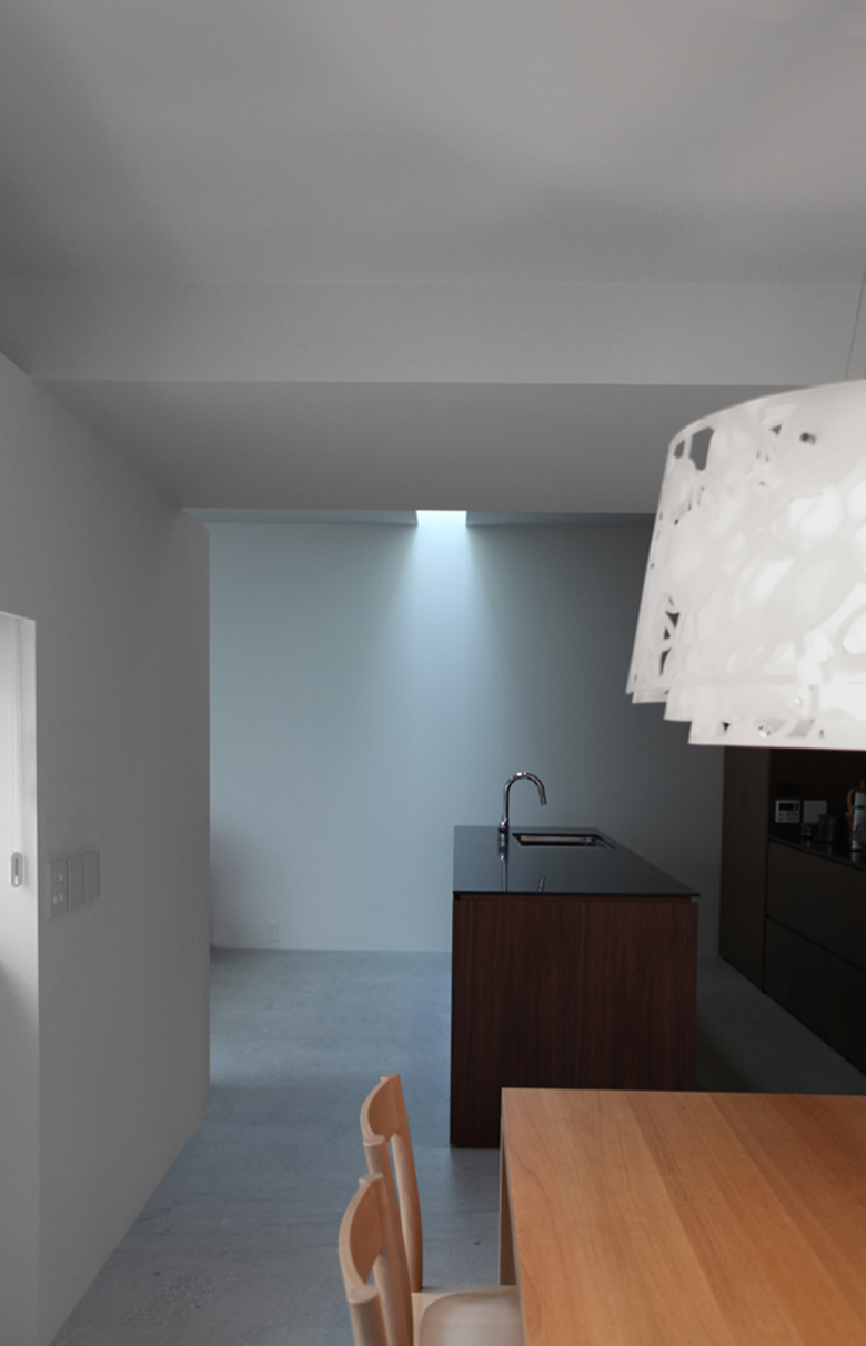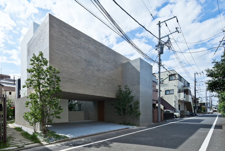 This house is located in a quiet residential neighborhood in Tokyo. Directly off the street, a concrete parking area sits below a “floating” concrete mass formed by the front of the building. Behind this driveway is a green courtyard, and behind this is the main entrance, ensuring the privacy of the residents. The courtyard fluidly connects each element of the residence through a spiraling circulation system that starts at the entrance and moves up to the second floor living and dining space. Plants and light from the courtyard bring a sense of nature and passing time to the interior, while the spiraling design constructs a continuous seamless space.