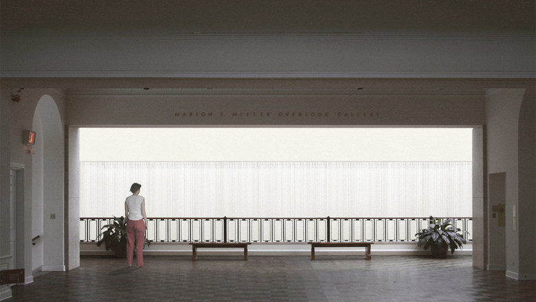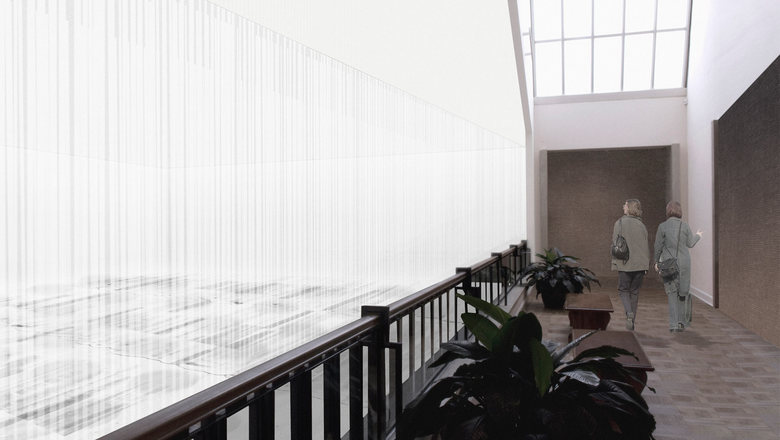 ‘Amplifier’ is both a space and a mechanism created to concentrate visceral qualities and emotive perceptions. The sculpture court is bisected between the first and second levels, creating two distinct yet interconnected experiences. Utilizing light, pressure, temperature and sound, the installation explores ideas of displaced experience: above and below, light and dark, compression and expansion.
