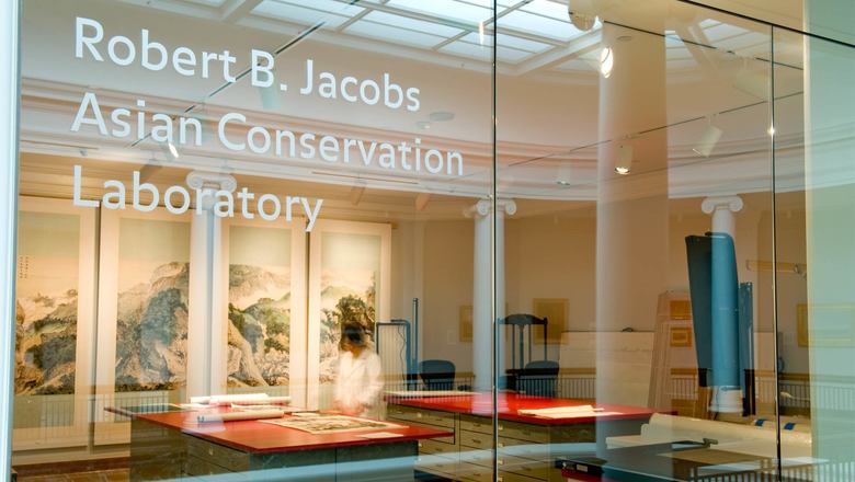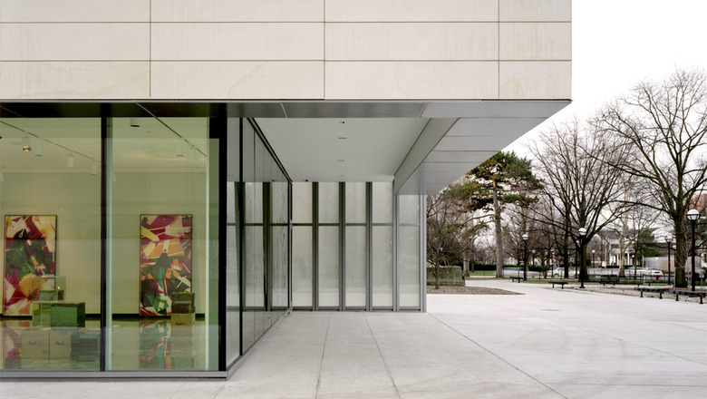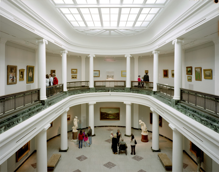 Where the century-old Alumni Hall is exclusive and introverted, the new architecture is open and immediate. Students flow along the the main circulation path through campus, moving by and through the galleries, classrooms, and public spaces. The building is formed by three cantilevered walls of concrete and limestone that radiate from a central open space. These armatures reach out to hold three distinct landscape rooms: to the south a new entry court adjacent to Alumni Hall, to the east a cloistered sculpture court, and to the north an open court and passage to the heart of campus. In contrast to the cantilevered walls, shells of steel and glass engage the courtyards, admitting light into the galleries and circulation corridors within. These enclosing veils of structure filter light from above and frame views to the landscape through a series of transparent lenses. A three-story “vertical gallery” defines the heart of the new building, a space that draws visitors into the galleries and unifies the new wing by visually connecting works from the museum’s collection.