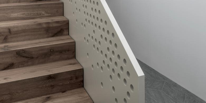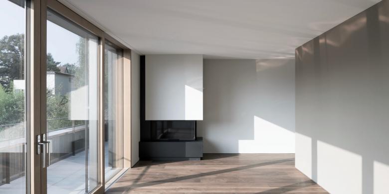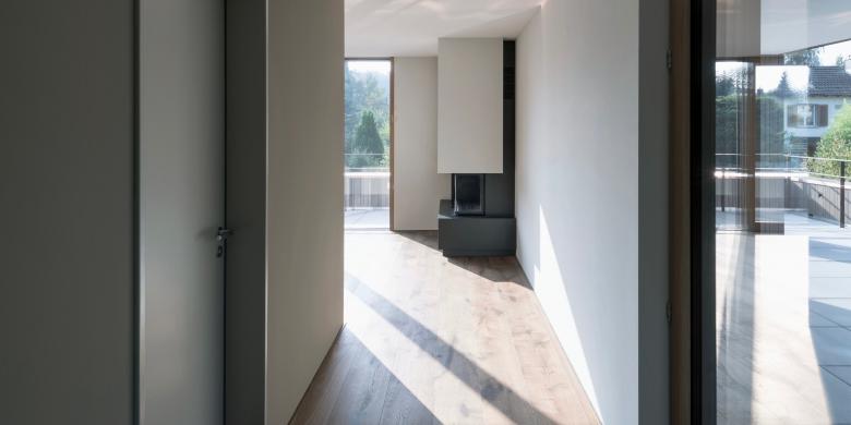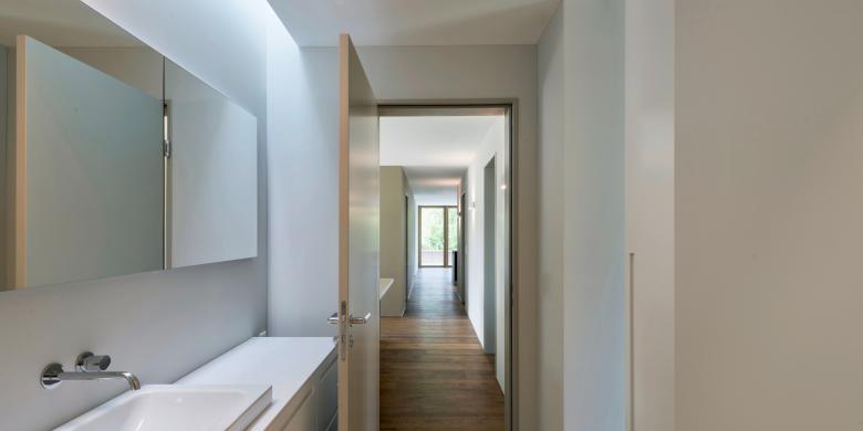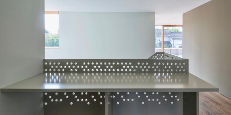 Die Umgebung der Gartenwohnung wird durch eine mit Kalksteinbeton gefertigte Mauer gefasst welche den Aussenraum zur Quartierstrasse schliesst. Im Obergeschoss besetzt die Dachwohnung mit den grosszügigen Terrassen die gesamte Geschossfläche. Die Grundrisse beider Wohnungen entwickeln sich um die zentralen Nasszellen.
