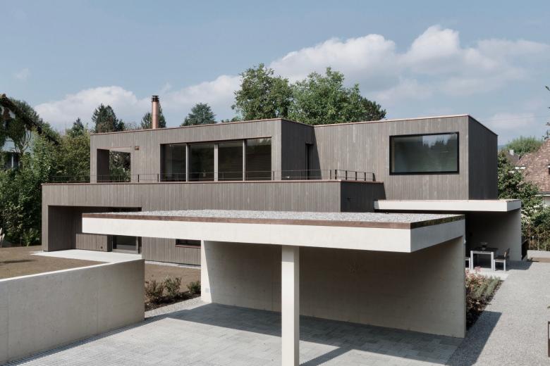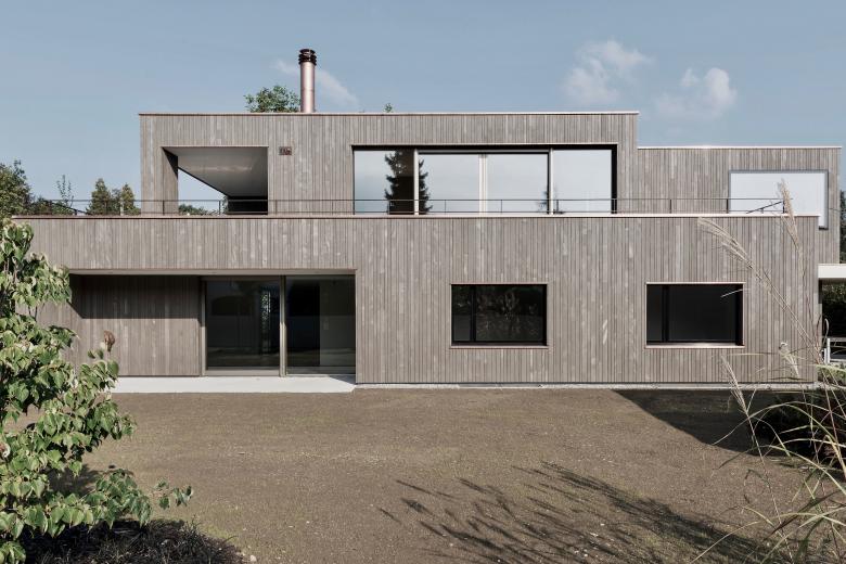 Die Fassaden werden von einem dunklen Holzkleid zusammengebunden. Die zurückhaltende Farbgebung schafft Raum für die Vegetation und verleiht dem Haus gleichzeitig Ruhe und Gelassenheit. Durch die Pigmentierung der vertikal gegliederten Holzlamellen mit eingestreutem Metallglimmer wird die Tiefenwirkung der abgestuften Fassaden zusätzlich verstärkt.