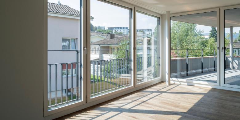 Gegen Süden durchsetzen grosse, raumhohe Fensteröffnungen das regelmässige Fassadenbild. Zur Quartierstrasse hin entsteht eine ruhige und regelmässige Lochfassade. In der Vertikalen endet der Treppenaufgang mit dem fassadenbündig angebrachten Panoramafenster. Die grosszügige Abmessung erlaubt den Ausblick vom rückwertigen Attikageschoss.