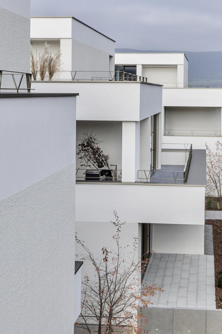 Die zurückhaltend, skulptural geformten Volumen erzeugen ein differenziertes Erscheinungsbild. Gleichzeitig tragen die abgestuften Fassaden zu einer grösseren Privatsphäre der jeweiligen Wohnseiten bei. Die Vor‐ und Rücksprünge der Fassaden sorgen für abwechslungsreiche Licht‐ und Schattenspiele.