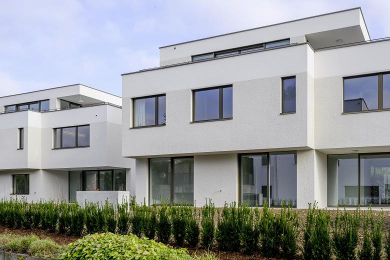 Ausgehend vom heterogenen Kontext und dem Bedürfnis nach Privatsphäre entwickeln sich die beiden zweigeschossigen Baukörper mit Attikageschoss über die horizontal getrennten Wohneinheiten.