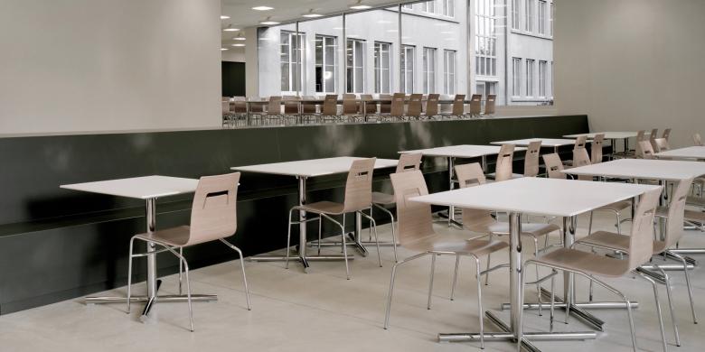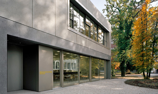 Der ehemalige Sitz des Aargauischen Versicherungsamtes, 1933 erbaut durch die Architekten Richner & Anliker, wurde zu Mediothek- und Gestaltungsräumen umgenutzt und mit einer Mensa erweitert, welche sich zur Hauptachse des Schulparks orientiert. Plausibel weiterbauen, so liesse sich in zwei Worten die Absicht der Bauaufgabe beschreiben. Analog zum Bestand, nicht in direkter Übertragung, erfolgte die Materialisierung der Fassaden.