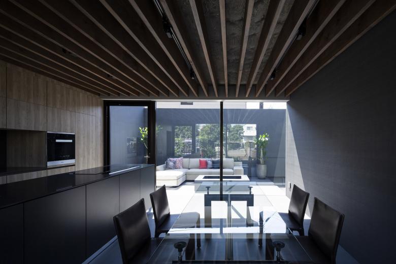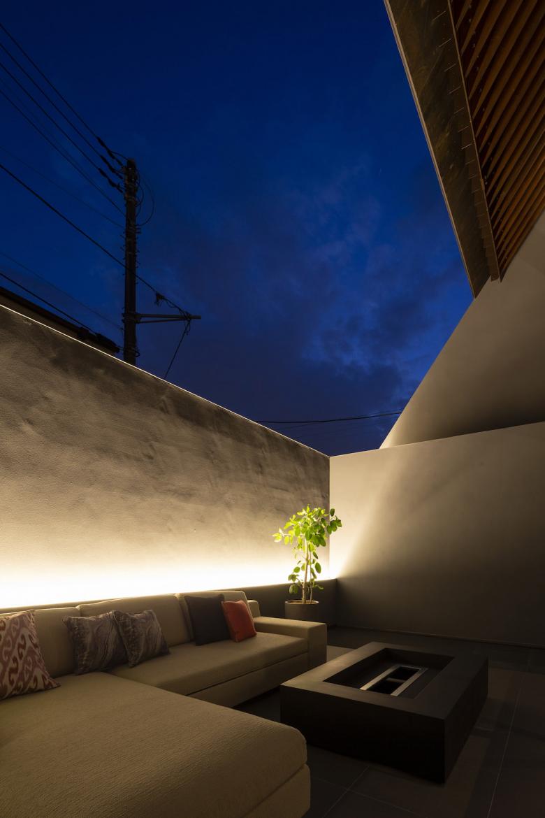 大きな開口部と連続する外部テラスはアウトドアリビングとして機能し、屋外ソファ等を設けることでアウトドアパーティーが楽しめる。中庭形式になっていることからプライバシーも保たれ、道路側とは思えない落ち着いた空間が広がっている。