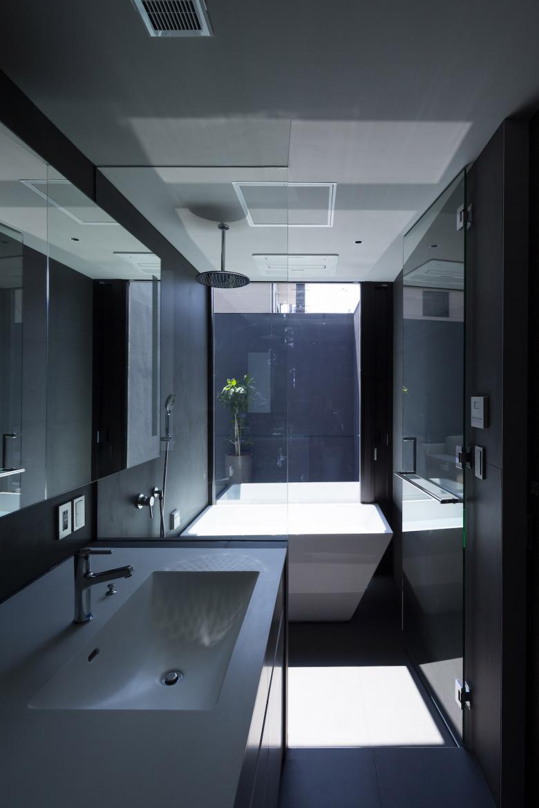 メタリックグレーのガルバリウム鋼板の屋根と外壁がモノコックな外観をつくりだしながら、生活者のプライバシーを確保し、道路面からは1階での生活の様子を窺うことはできない。屋根面に開けられた大きな開口からは室内に十分な光が降り注ぎ、コンパクトな空間の解放感を増幅させている。