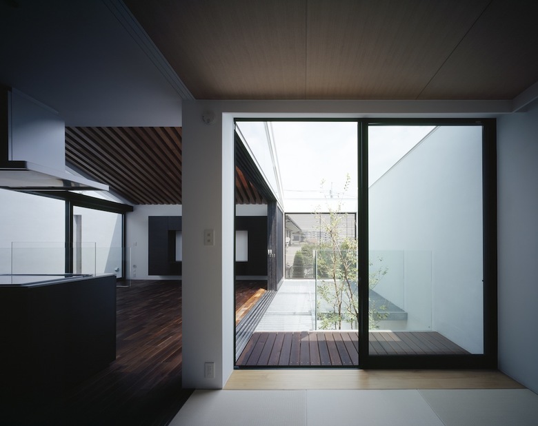 玄関脇から直階段を昇ると現れるのが吹き抜けのファミリールーム。両側に設けた大開口によって切り取られた空の景色が室内に取り込まれ、3枚の木製引戸を全開することで内外が連続する仕掛けだ。アイランドキッチン脇に設けたコンパクトな和室は客間としても利用が可能。バスルーム等水廻りを含めた全空間が外庭と連続しているが、繊細な木製ルーバーにより隣家や街路からの視線が遮られ、プライバシーと開放性を両立させている。垂木と野地板の色味を塗り分けたファミリールームの勾配天井の現しが室内に浮かび上がり、子供の遊び場として設えたロフトと吹き抜けを介してダイナミックに連続している。