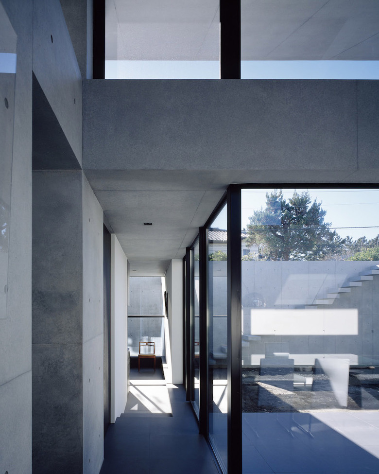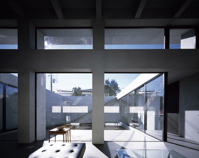 中庭に面したファミリールームは天井が高く、南北の高窓から降り注ぐ自然光を遮る出幅1800ミリの庇は、先端を薄くすることで建物に対し軽快な浮遊感を与えている。また1200ミリ角の格子状に分割された格天井はさながら武家屋敷のよう。屋根の荷重を支える構造本来の役割に加え、建物そのものをミニマムアートへと昇華させる効果も担っている。