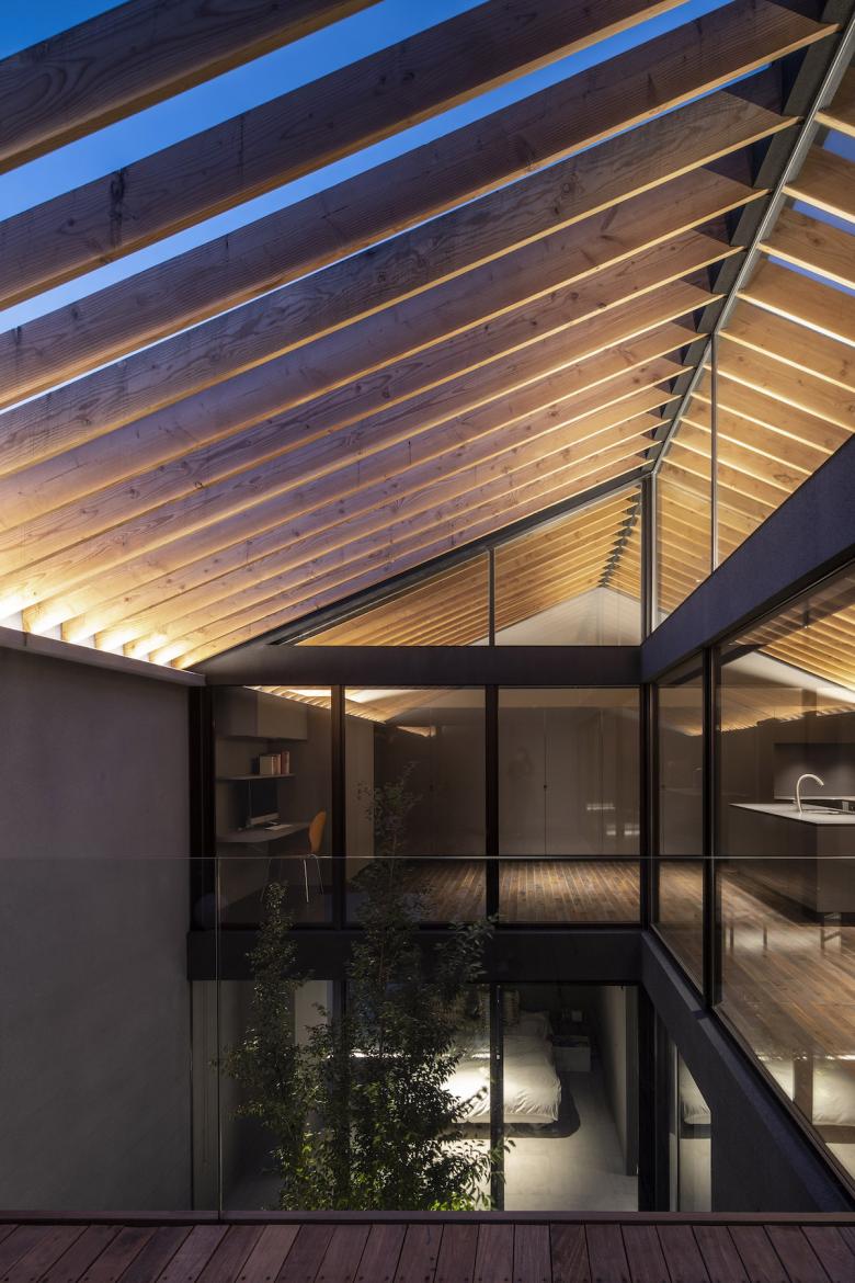 一方2階は家族全員が寛ぐパブリックルームとし、LDKの他にフリースペースや小さな書斎を設けている。天井を見上げると、この住宅最大の特徴である現しの垂木が室内から屋外に連続しパーゴラへと変化する。切妻のシンプルな屋根形状に沿って葉脈のようなストライプ模様が内外を横断することで空がトリミングされ、室内には光と影の模様が映し出されることで空間に奥行きが生まれている。