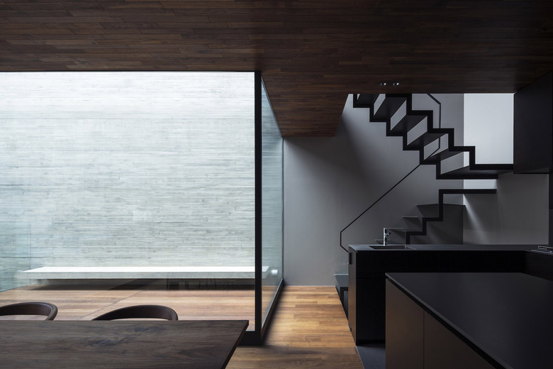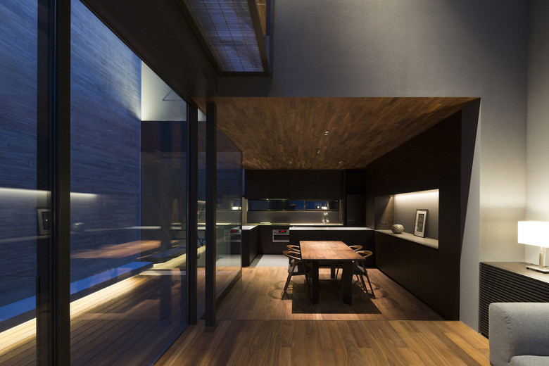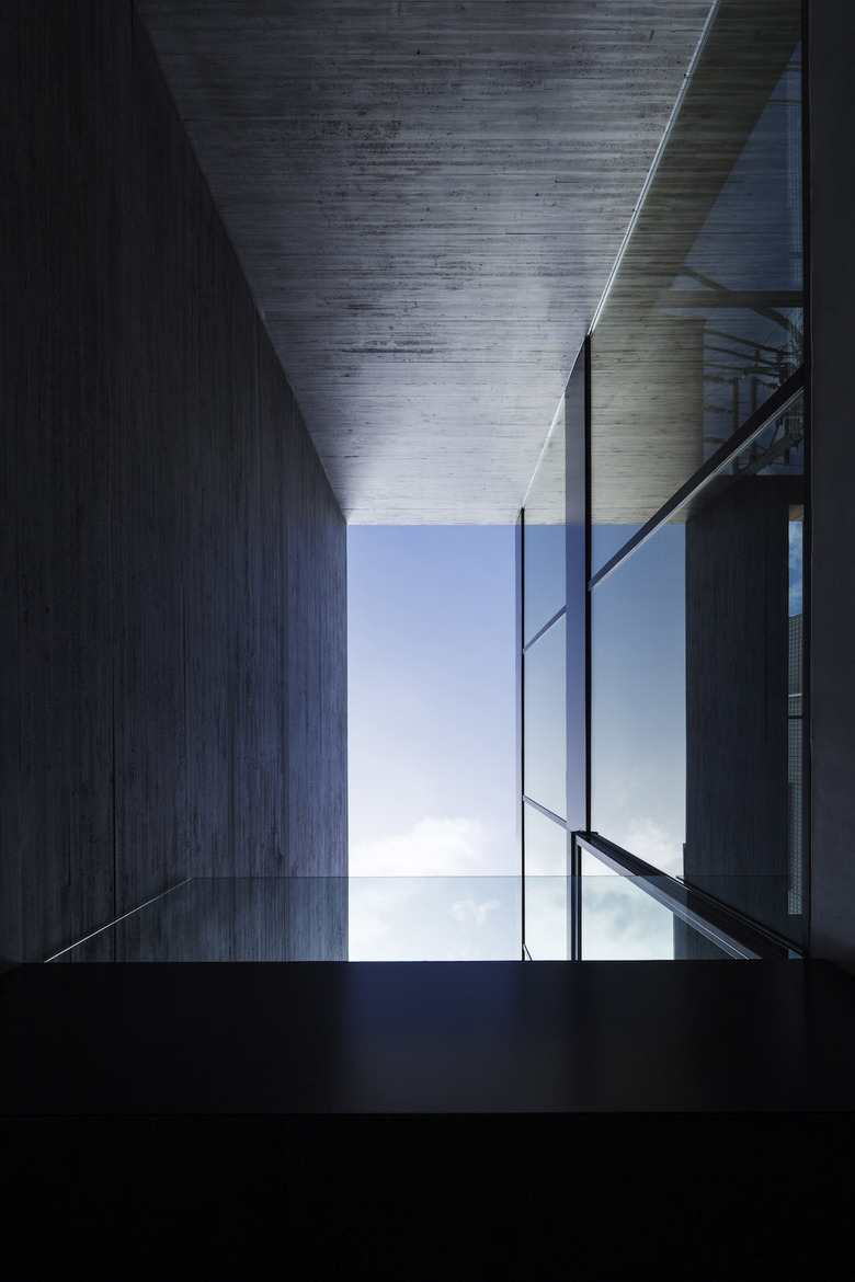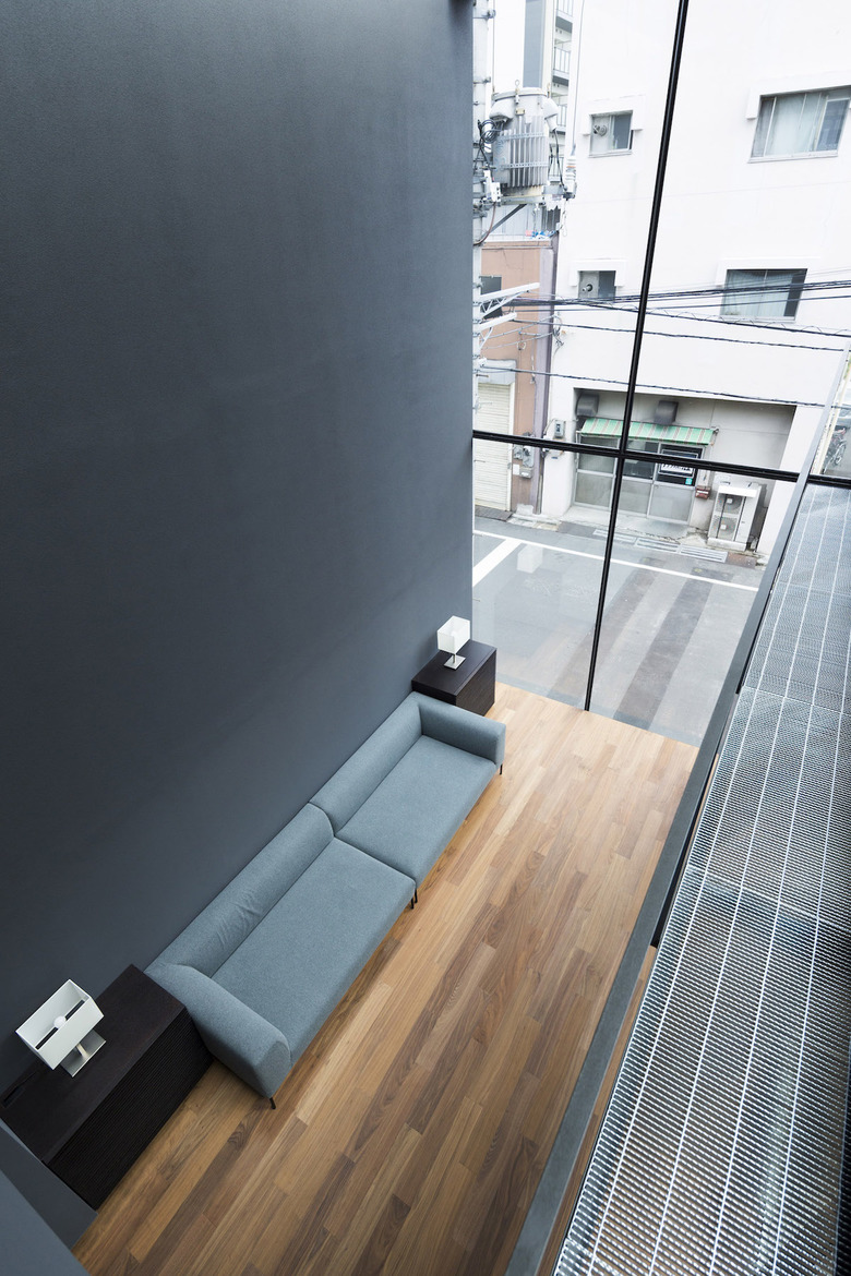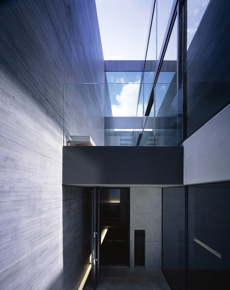 3階建ての建物は隣家3方に対してRC造の壁を立て、道路面のみ視界を開き、大型開口部はハーフミラーガラスにすることで、道路側の通行人の視界を遮る。東南側に吹き抜けを兼ねた中庭を設けることで、プライバシーを守りながらも光や風が感じられ、都市でもリゾート感を味わうことを可能にしている。