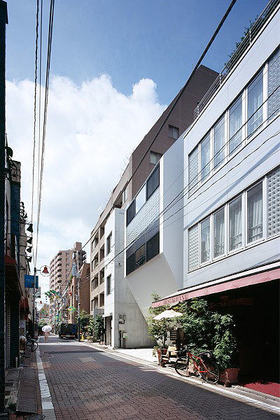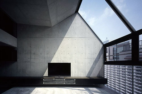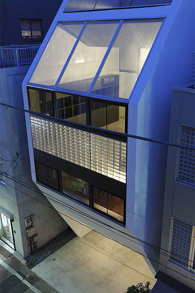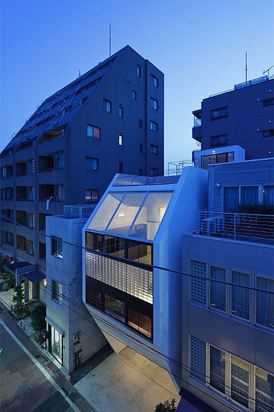 建主は橋梁関連企業でマネジャーとして世界を飛び回る40代のコスモポリタン。海外生活も長かったため、思い切って家族と両親が一緒に暮らす二世帯住宅の建築することに。ビジネスとの両立も考慮しつつ新たに購入した土地は都心の一等地。敷地は商店街に面する商業地域で、古い商店や工場が立ち並ぶ新旧が混在するエリア。中層ビルやマンションに囲まれた敷地は十分な採光や換気が期待できず、借景も望めないゆえ、外的要因に影響されることなく、いかに内部に採光し空に対して空間を開放できるかが課題となる。