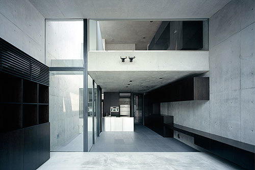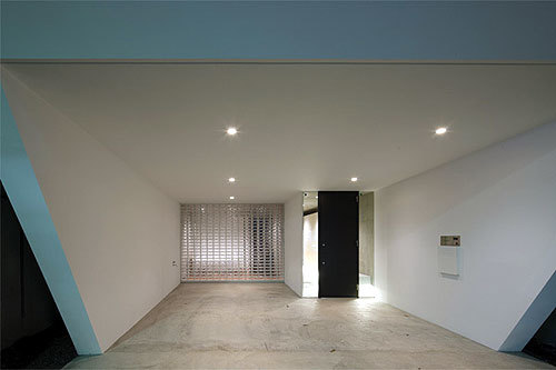 1階には子供部屋、2階には両親の空間とボディルームなどのコンパクトな個室を配置。大きな吹き抜けやトップライトが特徴的な3階のファミリールームは個室群とは対照的なおおらかな空間とし、コンパクトなライトウェル(光庭)があるのも特徴。4階の寝室はリビングの吹き抜けを介して視覚的に繋がっているため、最上階の屋上庭園へ自然に意識が誘われる仕組み。モノトーンで統一したクールなインテリアと同調すべく、外観は横長のガラスブロックとシャープなサッシュと天窓の組み合わせで構成。快適性や耐震性を重視してRC外断熱としている。ガレージ両サイドの壁面がカットされた特徴のある門構えは端正でありながらも、街並みに遊び心を与えている。