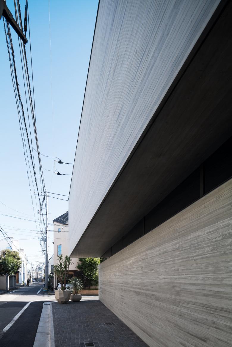 角地の特性を生かした建物ファサードは杉板型枠コンクリート打放しの外壁で、マッシブなボリュームを二段に積み上げたようなシンプルな構成。開口部を水平スリット窓のみにしているのはプライバシーと防犯面を考慮しているためである。