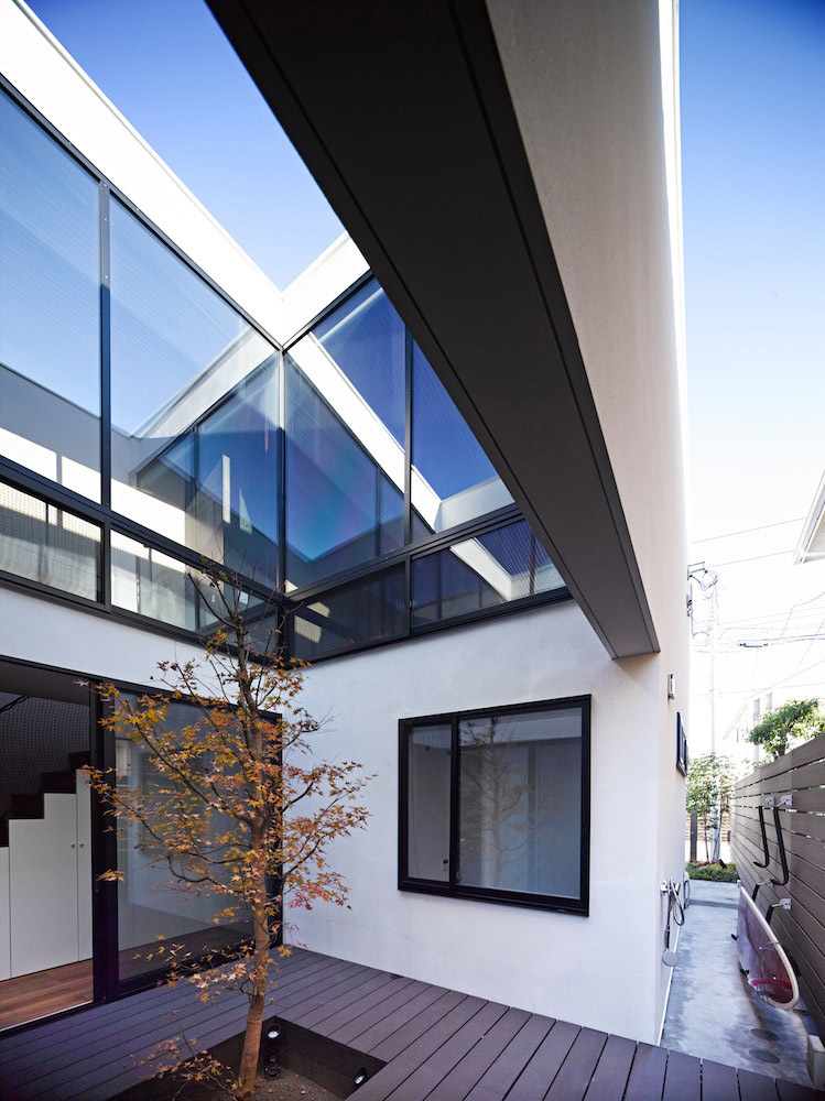 広告代理店に勤めるサーフィンが趣味のご主人は、中庭のある住宅で家族と生活を送れるよう海岸に程近いこの敷地を購入した。前面道路側に2台分のガレージとエントランスを確保するために2階躯体を鉄骨でオーバーハングさせ、浮遊感のあるファサードを構成した。