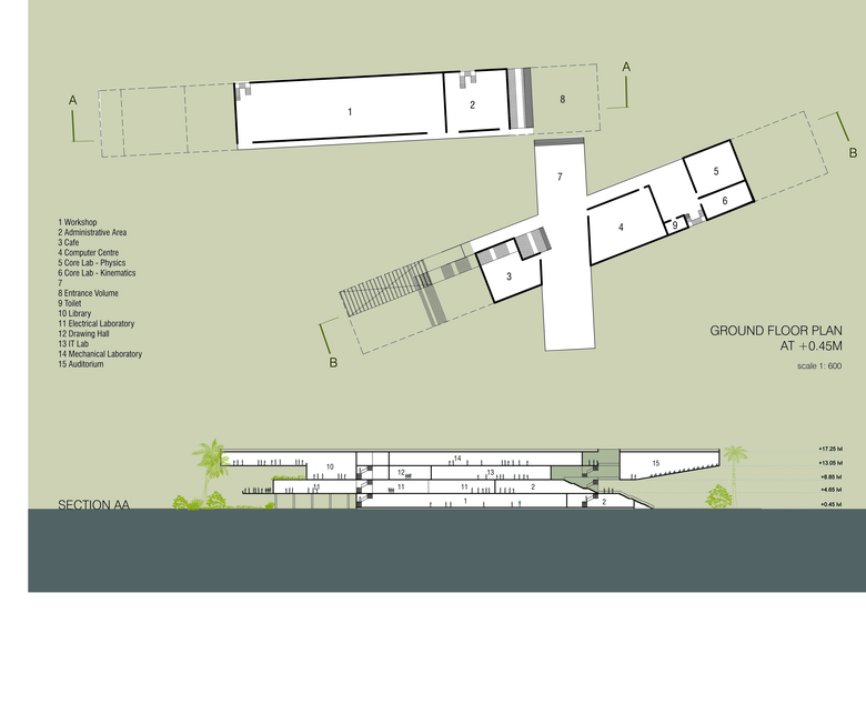 The buildings were drawn out as linear bars placed on the wetlands, with a series of open spaces along the length which opened up into public spaces and break out areas for common usage by the students. A series of open and semi-open spaces link the buildings while maintaining a constant connection with the outside. The elevation reflects the buildings orientation and responds to the climatic considerations of Kerala.