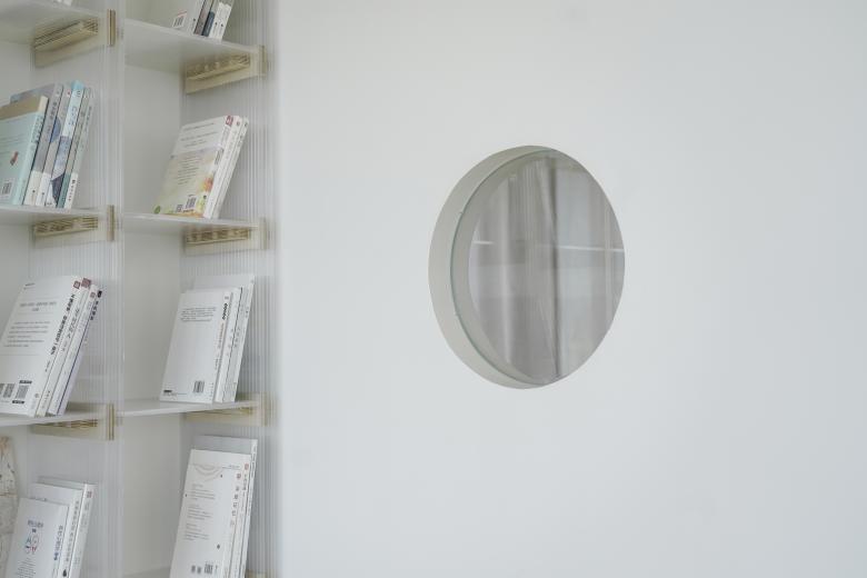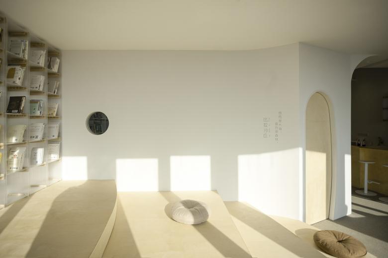 The wavy steps in front of the window are like rolling sand dunes, while the whole wall of bookshelves is like a forest waiting to be explored. The space along the windows on the west side is set for the leisure area, not only because it has the most beautiful scenery and the warmest sunset, but also considering the heat of the setting sun, it is not suitable for setting up seats for self-study, so the leisure area for short stay is the best choice. The small round hole on the partition wall between the leisure area and the self-study area is a little surprise designed for the self-study area. At a certain time, the setting sun will pass through the hole and shine into the self-study area, and the two separated spaces will share the beautiful moments of nature.