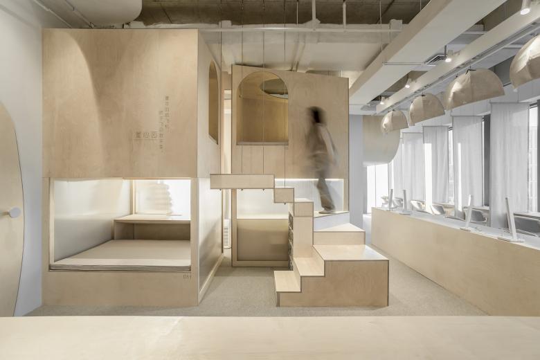 Atelier d’More was commissioned to design a self-study room for Bosuer as its first store opening in Shanghai, hoping to create a soft habitat in the city where struggling people can recharge. The project is located in the northwest corner of the 10th floor of Baolong Plaza office building in Qingpu, Shanghai. It is enclosed by floor-to-ceiling glass windows on the northwest and white walls on the southeast sides.