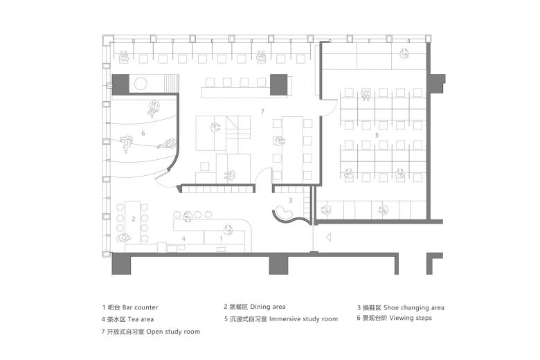 The characteristics of the study room determine that it will have higher requirements in sound insulation. We hope to create a quiet study space, and provide a leisure space for users to relax as well. Our key concern in the stage of plane layout is how to arrange these functional blocks, so that each space does not interfere with each other while connection can be found in between.