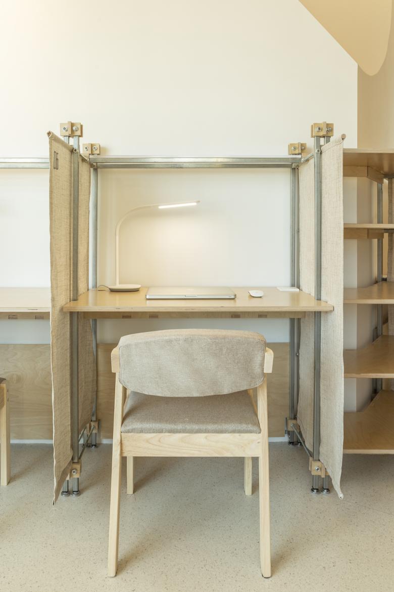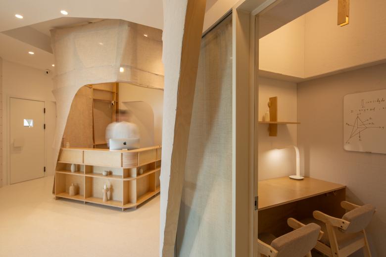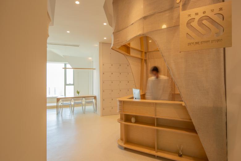这里的风景,不是生硬地搬弄造型,不是临摹景致;这里的天际注定是在近处的,举手登高便可及;这里的光影注定是人文的,点线交织;这里的景致注定是抽象的,棱角分明。我们在整体的空间中植入了五个互相映照的体块,分布于公共区和自习区,它们串联起了空间的功能流线——前台接待、双人研讨、多人自习,也建立起了整体风景的脉络。我们有意的将体块拔高,升高的体量似乎带来了类似“景观”的形象作用。但往往高大的形态会给人产生一种疏远的距离感,特别是在讲究高效利用的功能空间中,这种距离感,反而把空间引向了逼仄,人与人之间的关系也更加紧张。通过造型上的不断推敲,我们发现在向上的延伸过程中,体量微微向外展开,形成上大下小的势态能给人带来一种遮蔽感,这很像峡谷、大树的意向。而为了体块的造型能更加的柔和,并且最大化的抵消形态给人的压力,我们避开了传统硬质建造材料,选择亲和肌理的布料作为体块的外衣。我们设计了特定的造型轮廓语言,通过将预制的木构件拼装组合成支撑骨架,再覆盖布料塑形和收紧,有意将骨架的轮廓线显现形成一种柔软的张力。在这件柔软外衣下,似乎也由一个坚实的身体——当我们穿行于空间中,偶尔地驻足相遇,像是来到了一个巨大的身体遮蔽下。
