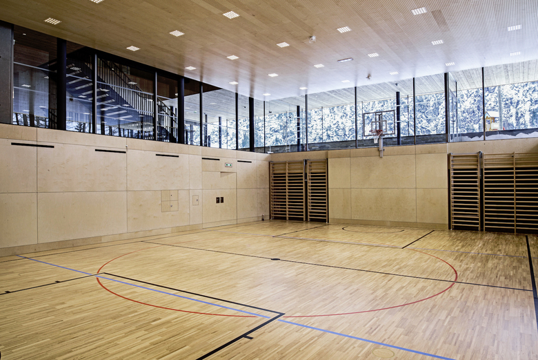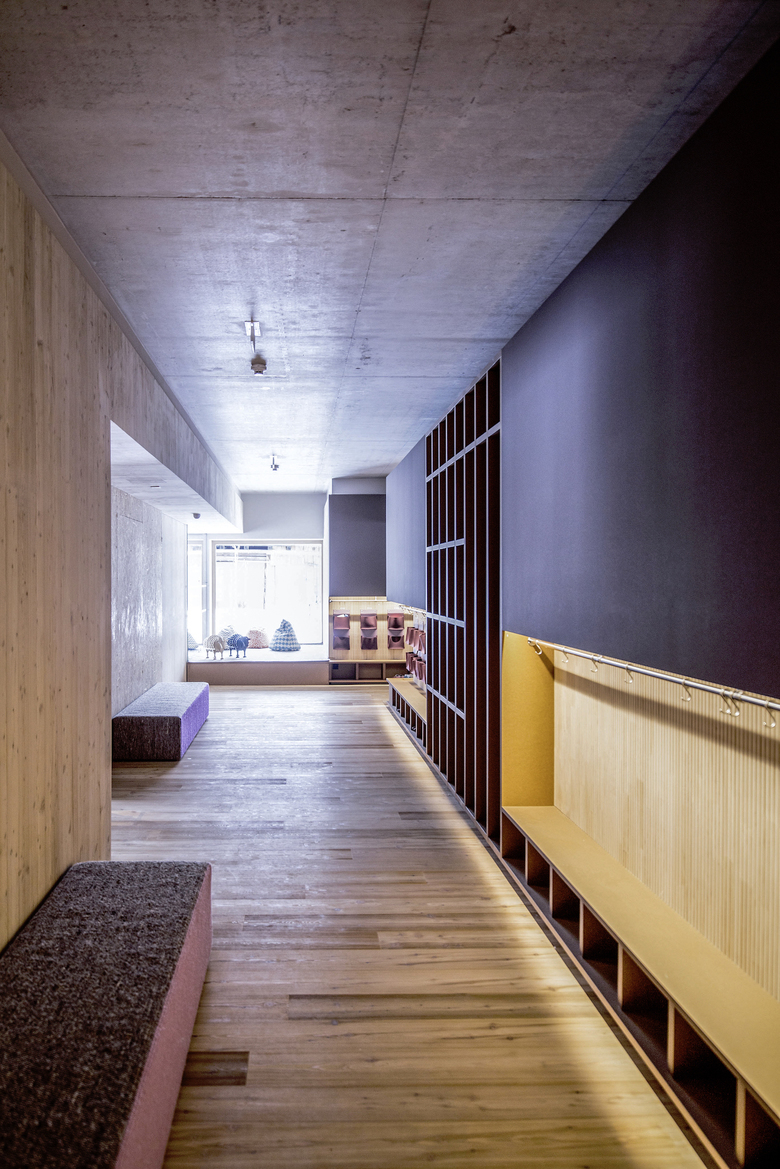 Ein zentrales Foyer verbindet und erschließt alle Bereiche und erlaubt gleichzeitig, dass alle Einrichtungen unabhängig voneinander benutzt werden können. Die Gruppenräume der Kinderbetreuung im Erdgeschoß sind flexibel gestaltbar und bieten den Kindern unterschiedliche Raumerlebnisse. Große Glasfronten gewähren auch den Kleinsten freie Sicht und holen den Außenraum scheinbar nach innen: Auf den breiten Fensterbänken in Sitzhöhe können die Kinder das Geschehen im Freien beobachten. Die Volkschule im Obergeschoss bietet neben den Unterrichts- und Arbeitsräumen mehrere Außenbereiche, welche den unterschiedlichen Lernbereichen zugeordnet sind.