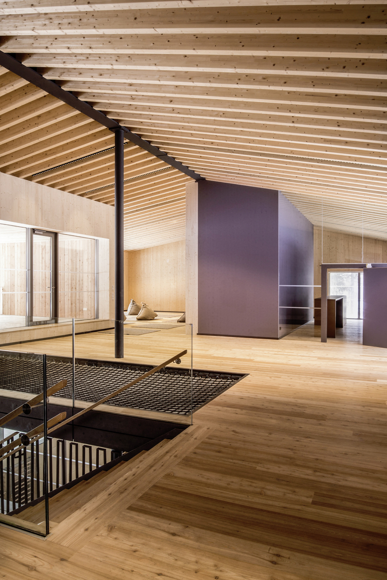 Holz spielt bei der Gestaltung des Innenraums eine zentrale Rolle: von den sichtbar bleibenden Massivholzwänden und der alles überspannenden Dachkonstruktion im Obergeschoss über akustische Verkleidungen mit Holzlamellen in Weißtanne bis zum Dielenboden aus heimischem Lärchenholz.
