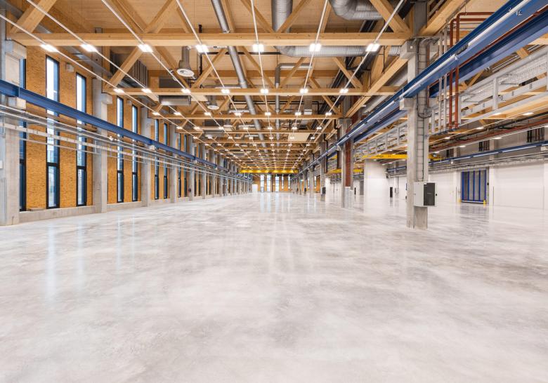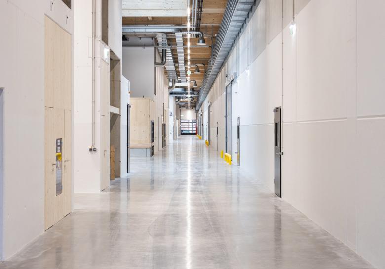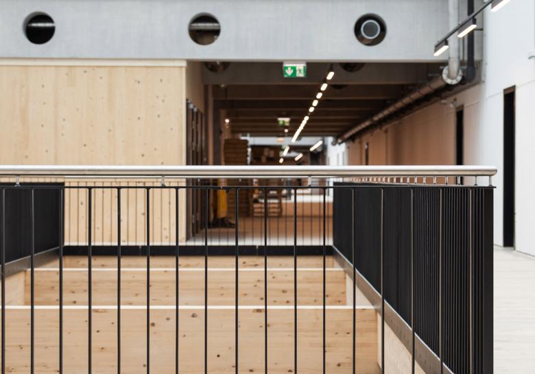 Der dreigeschossige, moderne Bau in der Dimension zweier Fußballfelder sticht als imposantes Aushängeschild des Werkzeugherstellers mit seiner durchgängigen Holzfassade ins Auge. Holz ist auch das Material, das den gesamten Bau trägt: Das sichtbare Tragwerk aus heimischer Fichte ermöglicht die optimale Ausnutzung des Raumes und in den massiven Verbindungen des Holzfachwerkes „hängen“ die Büros als Zwischengeschoss – so konnte Platz und Material für eine Zwischendecke eingespart werden.