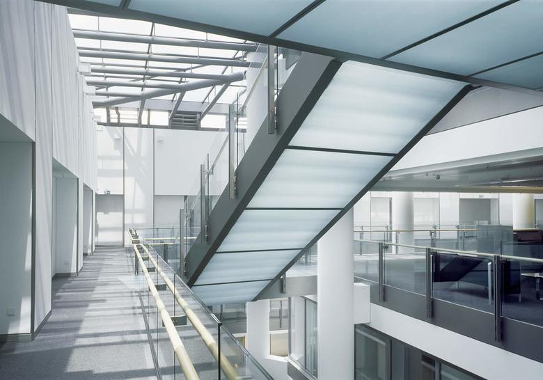 Beim Regelgrundriss wird zwischen den beiden verschieden hohen, transparenten Bürotürmen und dem massiven Kern unterschieden. Mit dem Mitarbeitercasino, den Restaurants, dem Ausstellungsbereich im Flachbau aus Naturstein und durch das English Theatre im Untergeschoss, wird ein wichtiger Beitrag zur Verbindung von öffentlichen Nutzungen und Büroflächen in einem Hochhaus geleistet.
