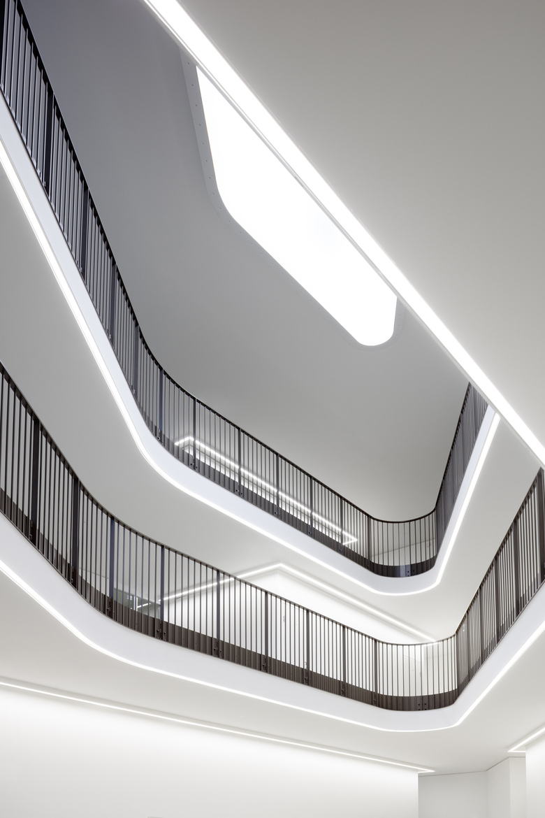 Optisch ähnelt Bauteil 2 in Materialität und Farbe der „Number One”, erhielt aber industrielles Flair. Erdgeschossig weisen Werkhöfe auf den Fokus des neuen Gebäudes hin: Industrie 4.0. Bewusst wurde die Sprache der Industriearchitektur eingesetzt. Es kamen etwa Nutzestrich, Stahlgeländer und Sichtbetonstützen zum Einsatz, die Metallfassade aus Bauteil 1 wurde subtil variiert.