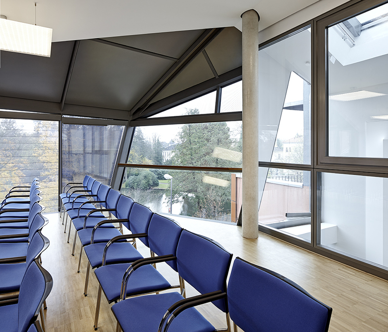 The desire to create a passive intelligent building that optimizes use of daylight has guided the design of the Schlaues Haus addition. Facing Schlosspark, the innovative, new South facade, with its integrated sun protection, is one of the energy concept components. The building envelope was developed on the basis of energy and climate simulations, and thus ensures an optimum balance of solar gain in the summer with minimal heat loss in the winter. A daylight corridor serves as a solar chimney and supports the use of natural ventilation and fume exhaust. The energy for heating and cooling is generated with a heat pump and through the use of geothermal installations. Electrical power is produced by photovoltaic panels on the roof and facade.