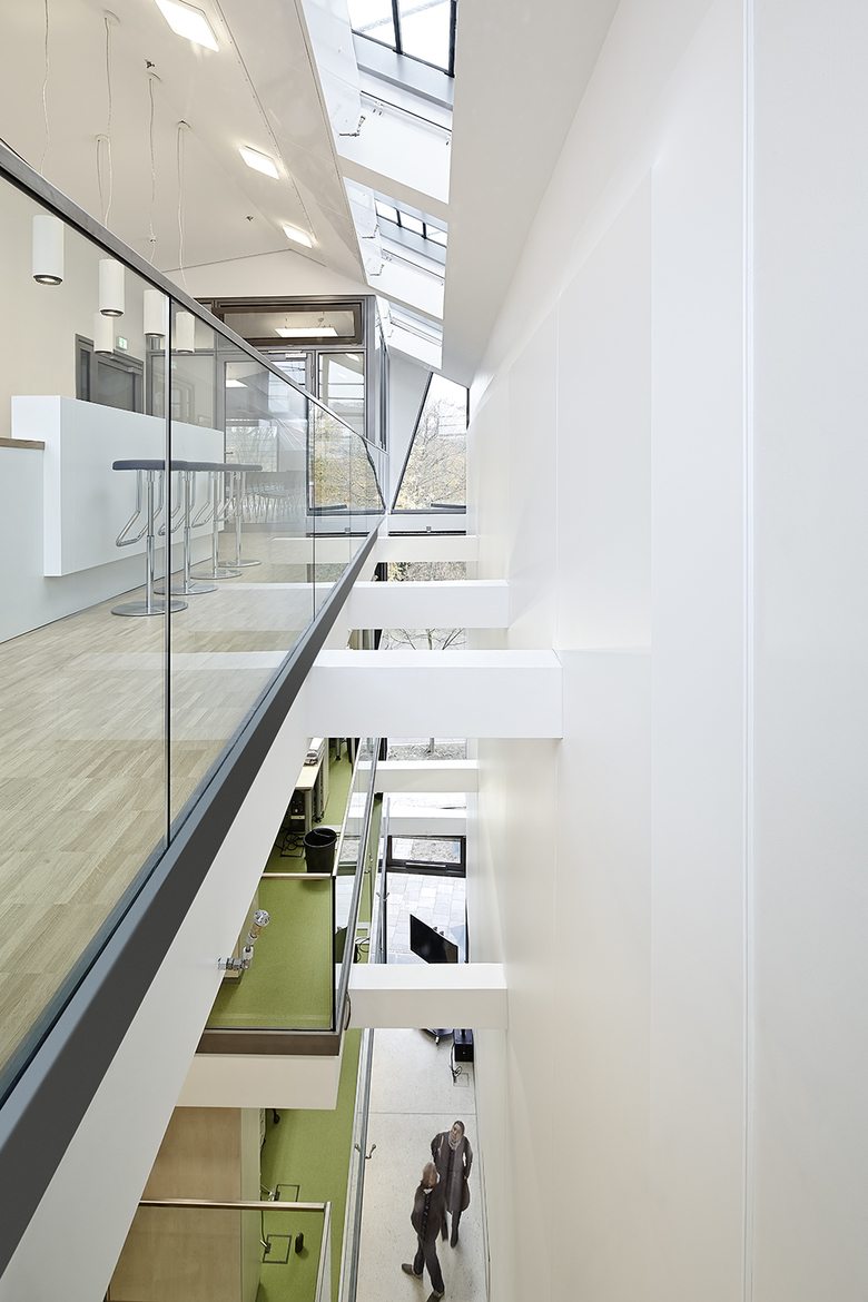 The ensemble consisting of the old building and the extension harmoniously fits into the surroundings. The dimensions of the quarter are referred to by the structure of the new part. The split level organization allows users to experience the transition between the existing building and new building through the use of projecting levels and voids.