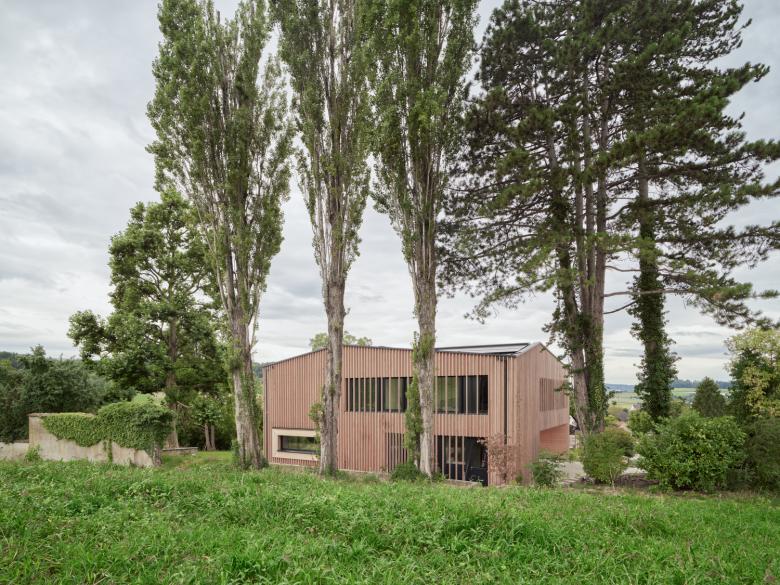 Das beschauliche Islikon liegt eingebettet in die sanfte Landschaft des schweizerischen Thurgaus. Das leicht abfallende Grundstück liegt am Rande des Ortes inmitten einer wunderschönen landschaftsräumlichen Situation mit alten, großen, Baumbeständen und freien Blickbeziehungen nach Süden und Osten. Das Haus ist ein Ersatzneubau und fügt sich harmonisch mit etwa demselben Fußabdruck wie sein Vorgänger in das bestehende ortsräumliche Gefüge ein. Somit ist ein späteres Nachverdichten am Grundstück und Spielraum für nächste Generationen weiterhin gegeben.