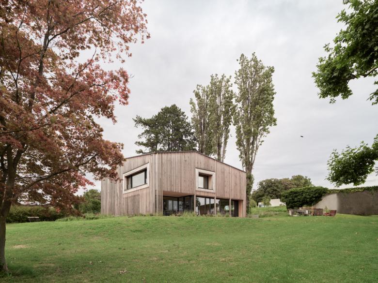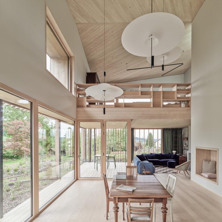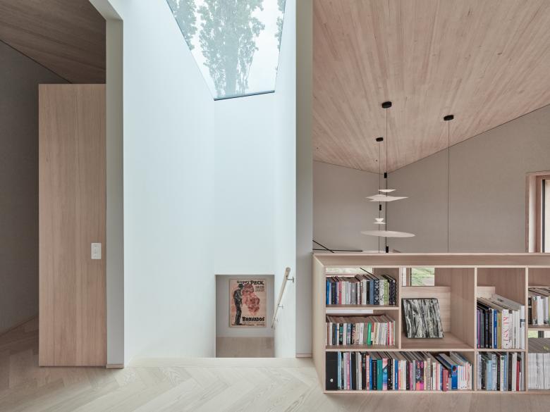 Im einfachen, dichten Volumen sind sämtliche Funktionen des täglichen Lebens integriert. Um den mittig im Gebäude situierten und via Zenitallicht belichteten Treppenhauskern fächern sich die Raumzonen auf verschiedenen Ebenen auf. Vielfältige Blickbeziehungen schaffen Verbindungen quer über alle Raumschichten. Präzis gesetzte Öffnungen integrieren den Naturraum im Inneren und geben immer wieder überraschende Blickbeziehungen frei. Zum Oberlicht hin falten sich die Deckenelemente und formen ein windmühlenartiges Dach - ein richtungsloses, verwurzeltes Gebäude entsteht, das nach allen Seiten kommuniziert. Gefilterte Holzelemente graduieren Privatheit, Lichteinfall und schaffen eine atmosphärische Dichte.
