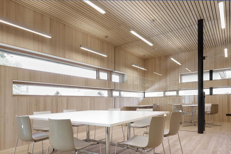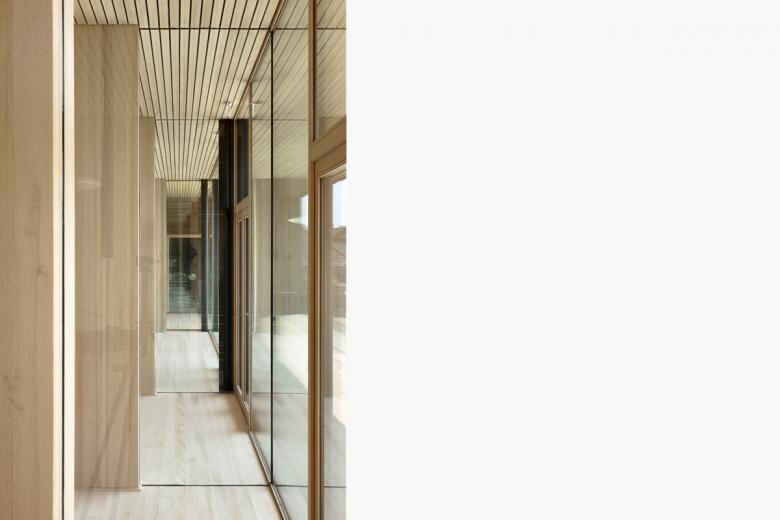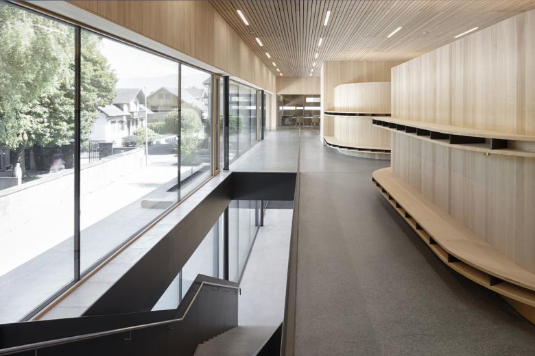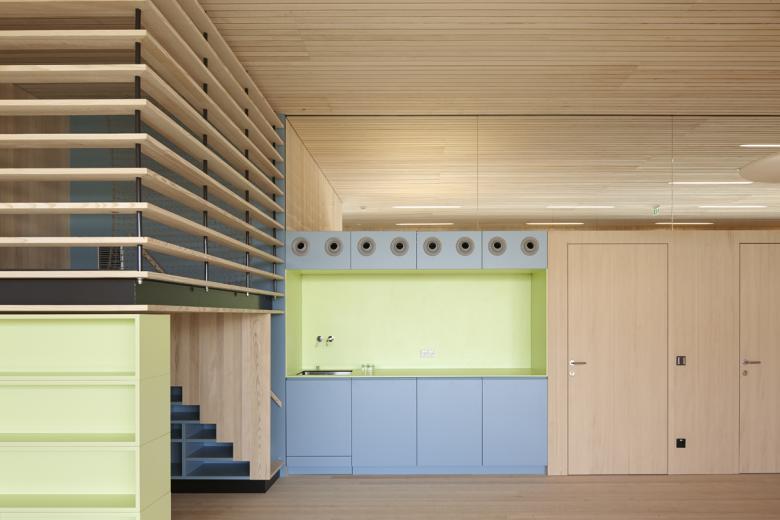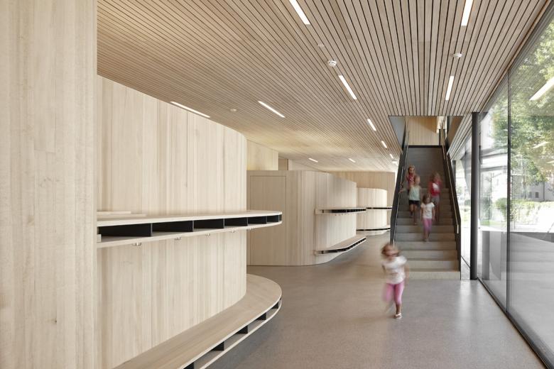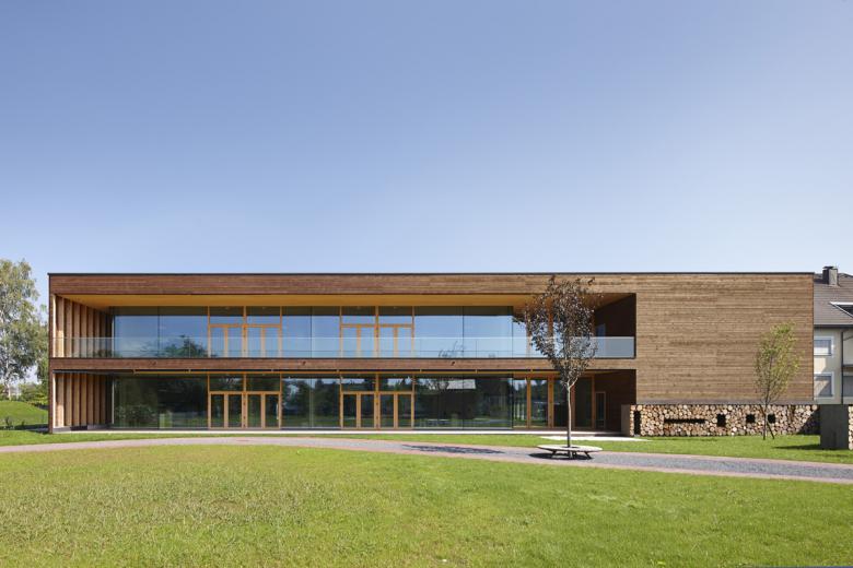 Das kompakte Gebäude mit Kindergarten, Mehrzwecksaal und Ortsteilbüro definiert ein neues Zentrum für Lustenau-Rheindorf. Es gibt keine Vorder- und Rückseite, der Baukörper öffnet sich nach Norden – Straßenraum und Foyer des Ortsteilzentrums – wie nach Süden – Spiel- und Freiräume. Die Schmalseiten verstärken die Körperlichkeit mit geschlossener Hülle. Nach Osten, zur Zufahrt, mit den abstrakten Öffnungsschlitzen, nach Westen mit dem Außentreppenraum. Durch die Positionierung des maßstäblichen Baukörpers entlang der Friedhofsmauer werden natürliche Außenräume geschaffen. Es entsteht ein „Campus“, die rad- und fußläufige Erschließungsachse fokussiert den Kirchturm, der Angel- und Orientierungspunkt des Ortsteiles Rheindorf.