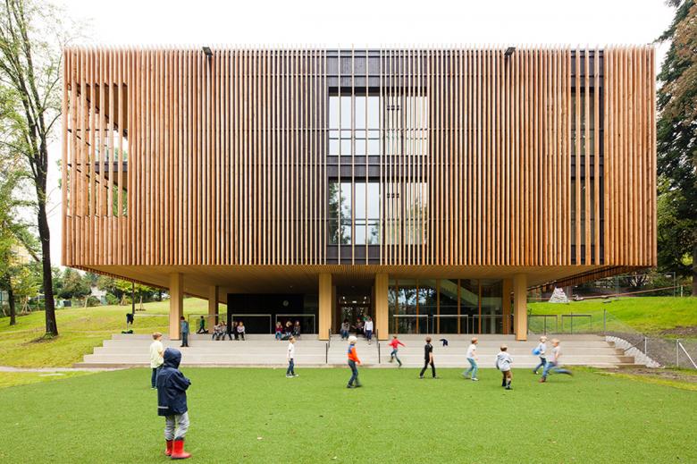 Umgesetzt sind diese Lehr- und Lernprinzipien in einem architektonischen Konzept mit offenen Strukturen im Sinne eines Clusters mit Homebases (»Klassenzimmer«) für Kinder und Lehrende sowie mit flexiblen Lerninseln, einer Freiklasse und weiteren Außenbereichen. Die Abgrenzungen durch Flure entfallen, es entsteht ein fließendes Raumgefüge.