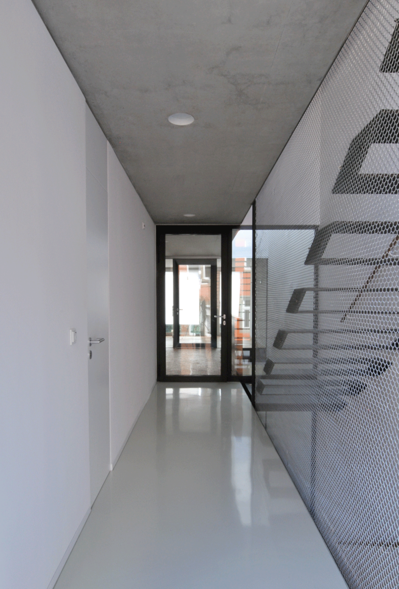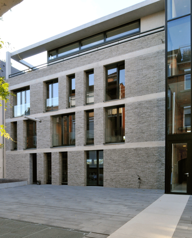 Eine Baulücke zu schließen war die Planungsgrundlage dieses Projektes, denn der Neubau eines Firmensitzes sollte nicht in einem gesichtslosen Gewerbegebiet mit schlechter Anbindung an den öffentlichen Nahverkehr entstehen, so der Wunsch der Bauherrschaft. In dem 4-geschossigen Gebäude musste ein umfangreiches Raumprogramm mit unterschiedlichsten Nutzungen untergebracht werden bei gleichzeitig hoher Flexibilität um wechselnde Organisationsformen realisieren zu können. Der Hauptzugang, an einem städtischen Platz gelegen, präsentiert sich als Einschnitt ins Gebäude im „typischen Firmenblau“. Lufträume im Haus verbinden die auf mehrere kleine Flächen verteilten Nutzungen.