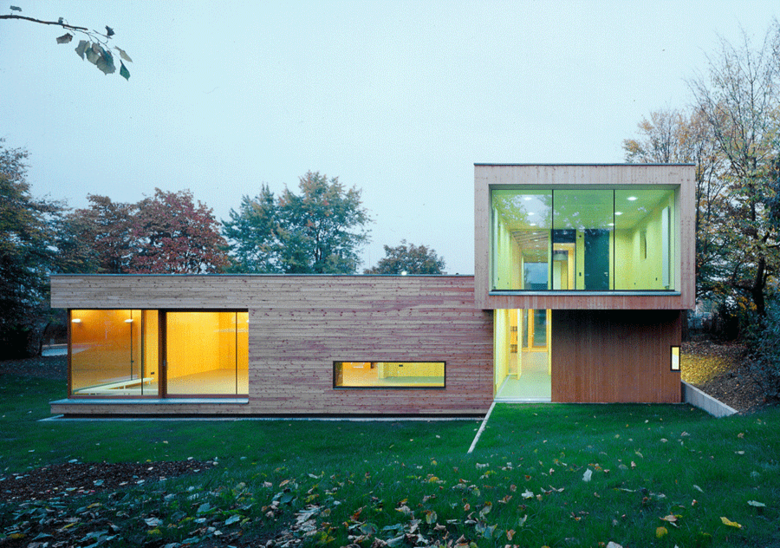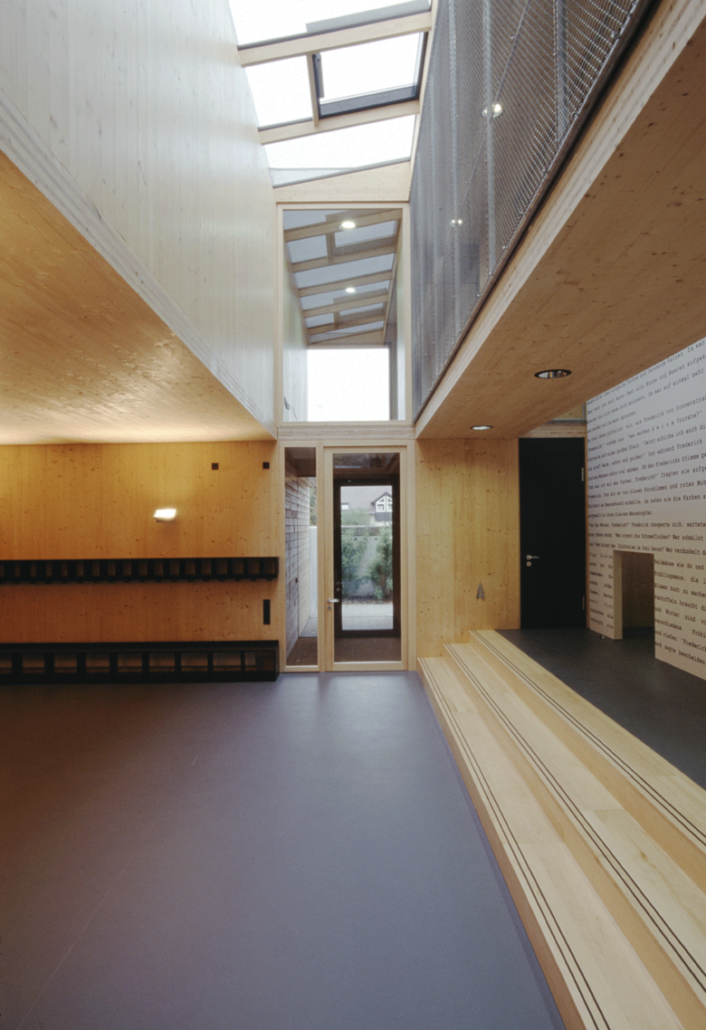 Der Kindergarten, ein reiner Holzbau, der in Massivbauweise mit großformatigen Wandpaneelen erstellt wurde, steht auf einem parkähnlichen Grundstück im Ludwigsburger Stadtteil Eglosheim. Das einfache additive System von Wand- und Deckenelementen sowie der hohe Vorfertigungsgrad erlaubten eine kostengünstige Konstruktion. Das offene Betreuungskonzept spiegelt sich in der Architektur wider: sehr unterschiedliche Räume wie Gruppen-, Werk- und Sanitärräume gruppieren sich um eine zentrale Multifunktionsfläche. Optisch markant ist der mittig angelegte ellipsenförmige Raum, der ausschließlich der Wahrnehmung von akustischen und optischen Reizen dient.