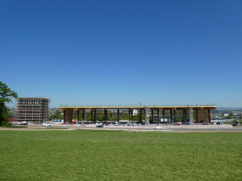 Die 13m hohe Halle besteht aus massgefertigten Stahlstützen die in Bodenplatte mit Riegelsystem eingespannt sind. Die Bodenplatte aus Monobeton und das kombinierte Retentionsbecken sind tiefenfundiert. Das Holzdach kragt auf zwei Seiten bis zu 10m aus. In der Halle befindet sich ein Zwischenboden aus einer Stahlkonstruktion mit Monobeton als Verbunddecke.