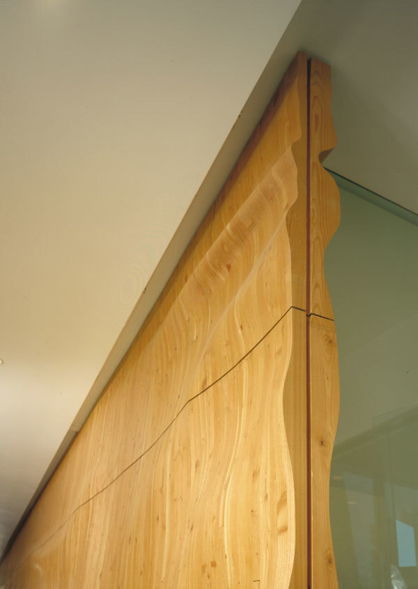 Two basic materials, wood and plastic are transformed from benign surfaces into sculpted space. The one hundred foot long wood wall was created by a direct transfer method. Computer models were sent directly from the architect to a computerized CNC router where 74 Glue laminated beams of varying thickness were sculpted by direct automation, virtually eliminating the traditional handcraft. Several studio entry doors were integrated into the pattern of the wood and seamlessly disappear. The result is a surface that is spatial, has depth and comes alive with movement. The perception that wood is a static dead material is ransacked. It is, in fact, alive with energy and moves through the space with its occupants and visitors.